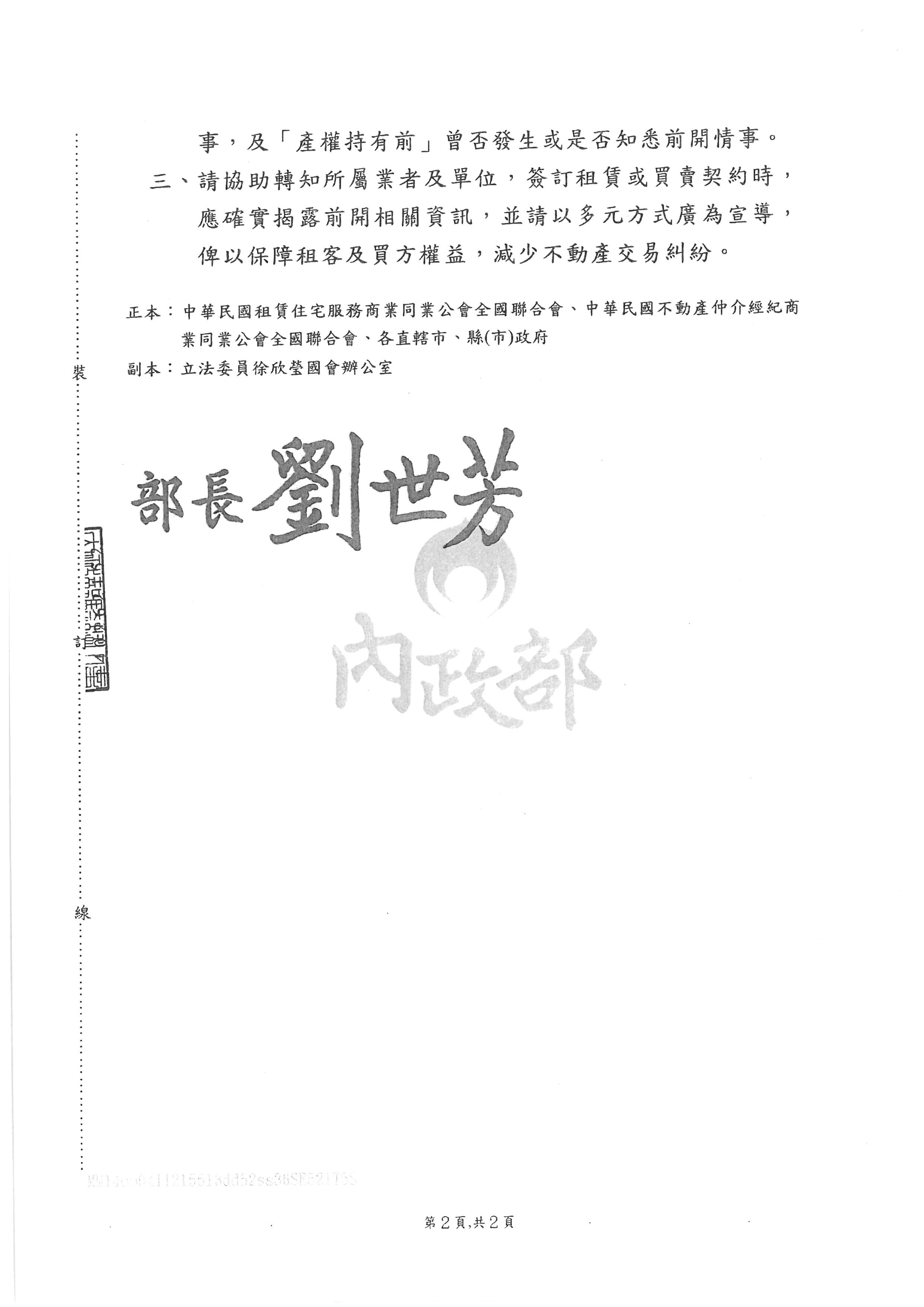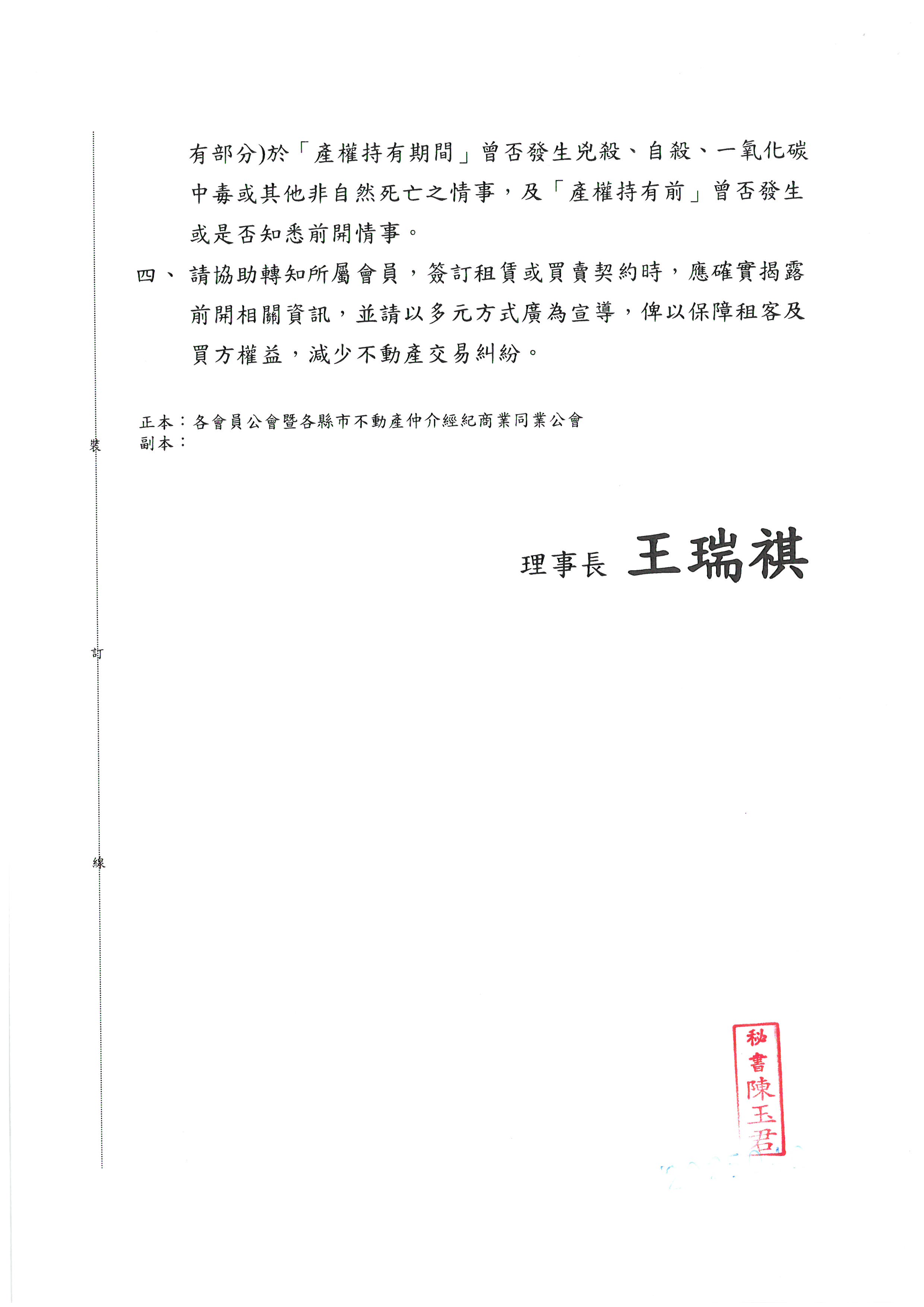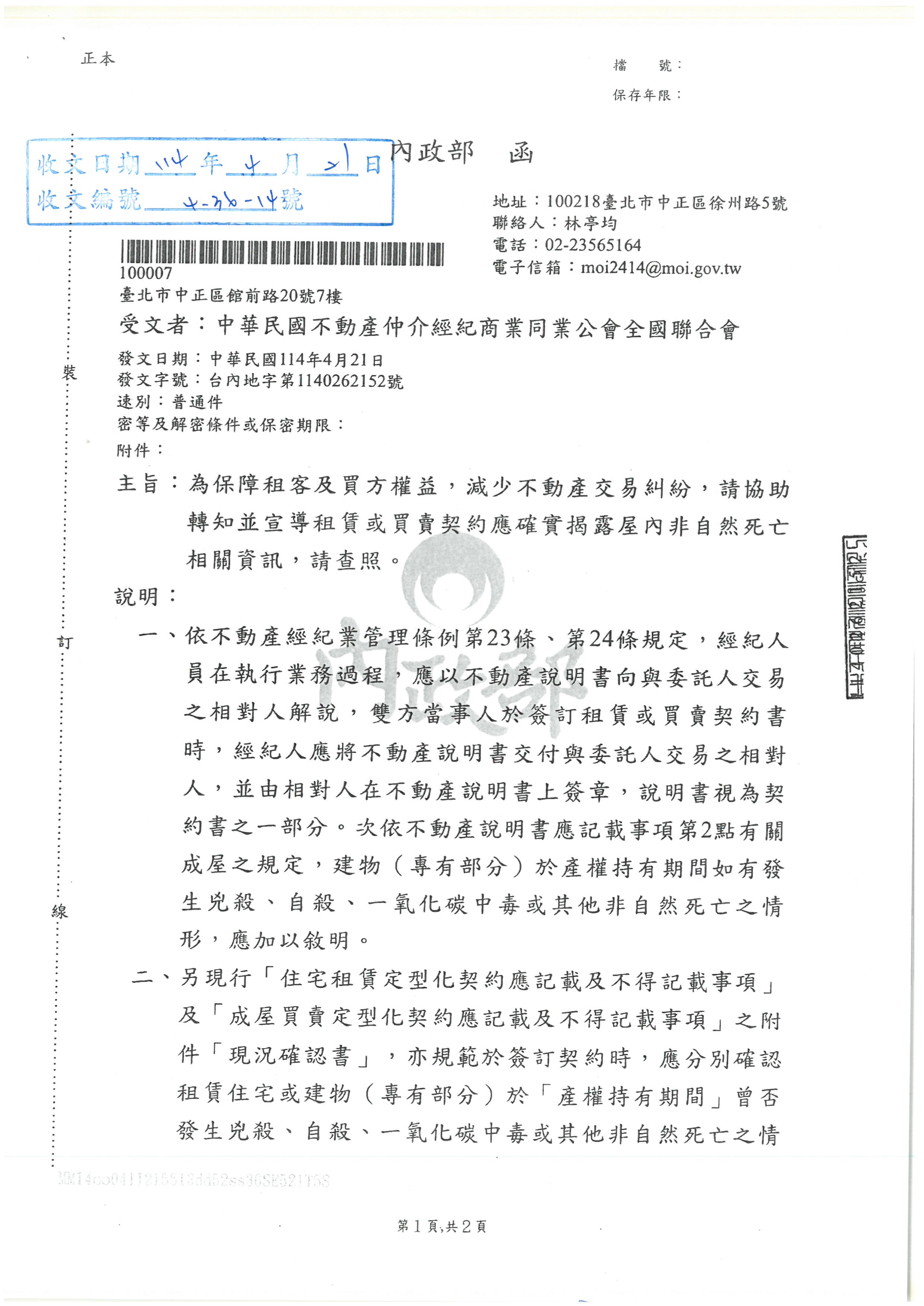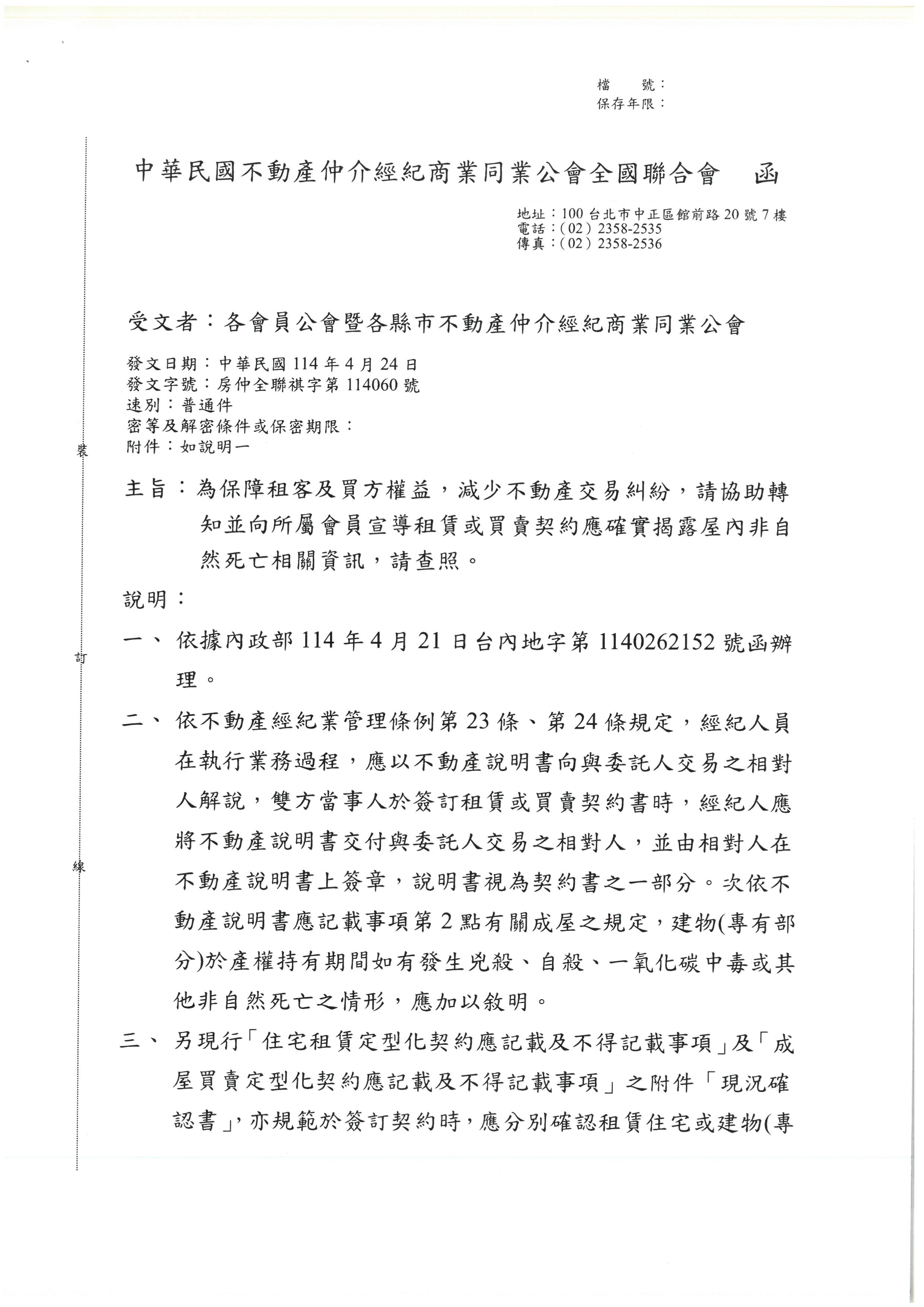 為保障租客及買方權益,減少不動產交易糾紛,請協助轉知並宣到租賃或買賣契約應確實揭露屋內非自然死亡相關資訊,請 查照。