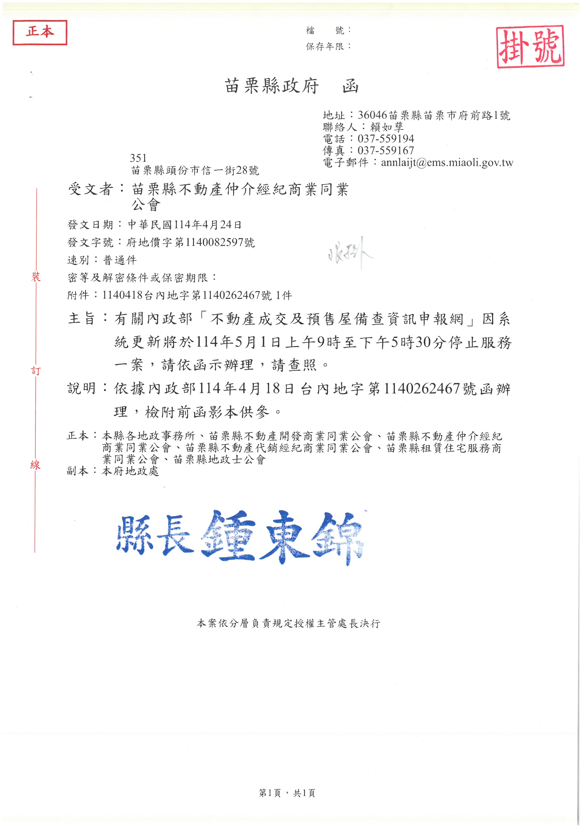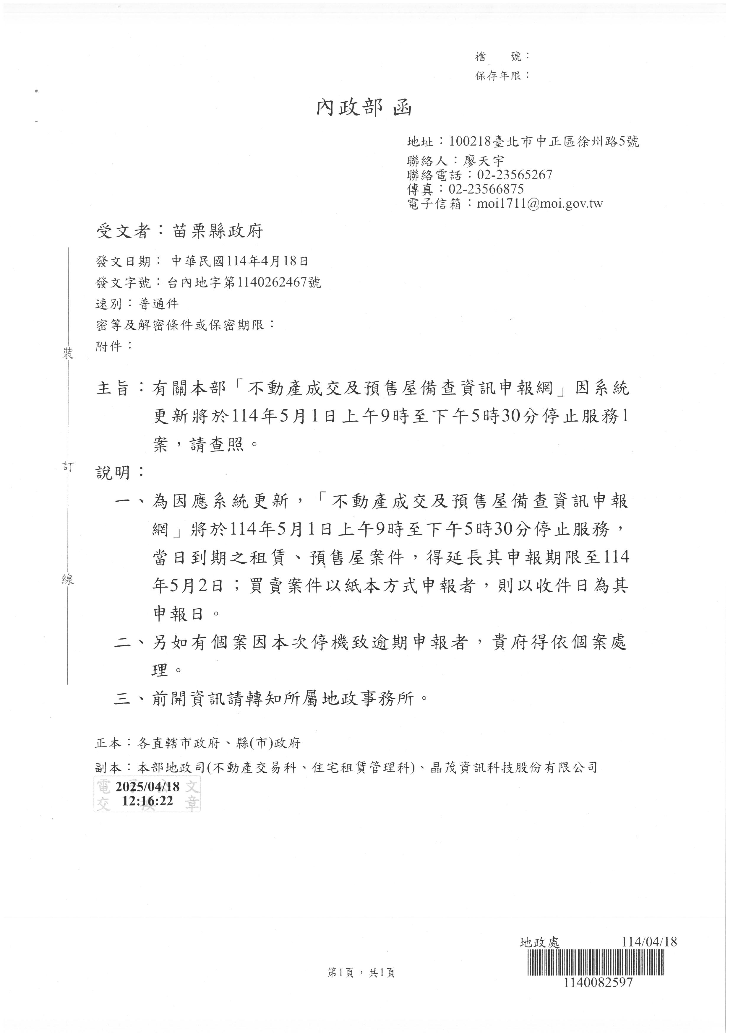 有關內政部「不動產成交及預售屋備查資訊申報網」因系統更新將於114年5月1日上午9時至下午5時30分停止服務一案,請依函示辦理理,請查照。
