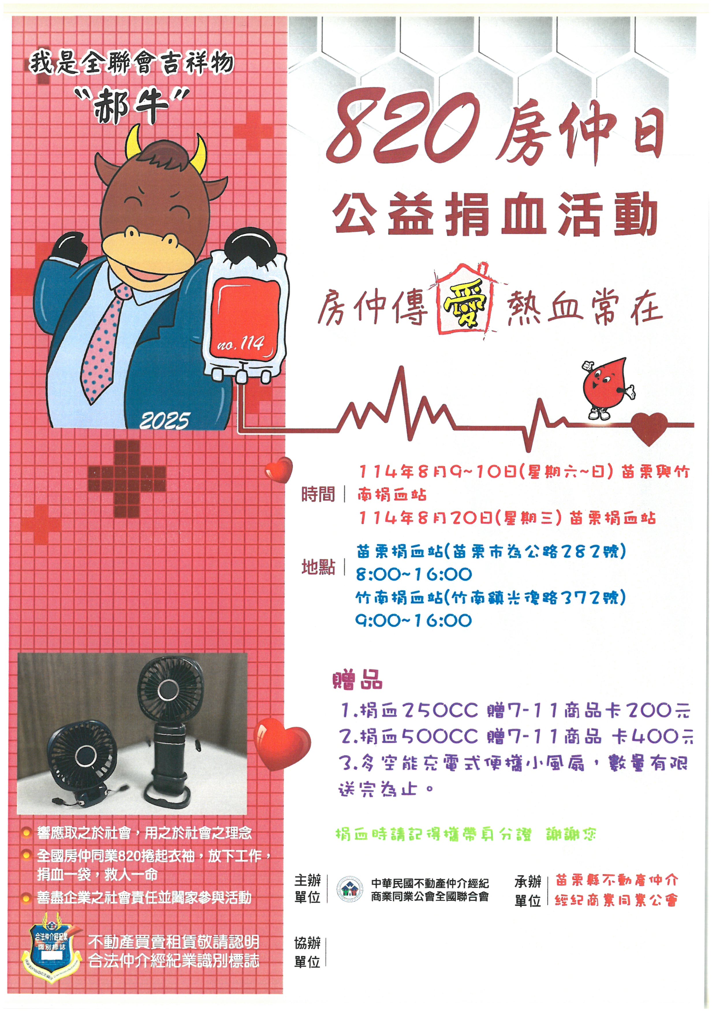 訂於114年8月9~10日(六~日)及8月20日(三)在竹南鎮與苗栗市捐血站均有820房仲日公益捐血活動,備有7-11商品卡與精美贈品(數量有限.送完為止),房仲傳愛熱血常在,捐血一袋救一命,邀請您一起做愛心活動。檔案下載(SKM_C454e25072114290_0001.jpg)