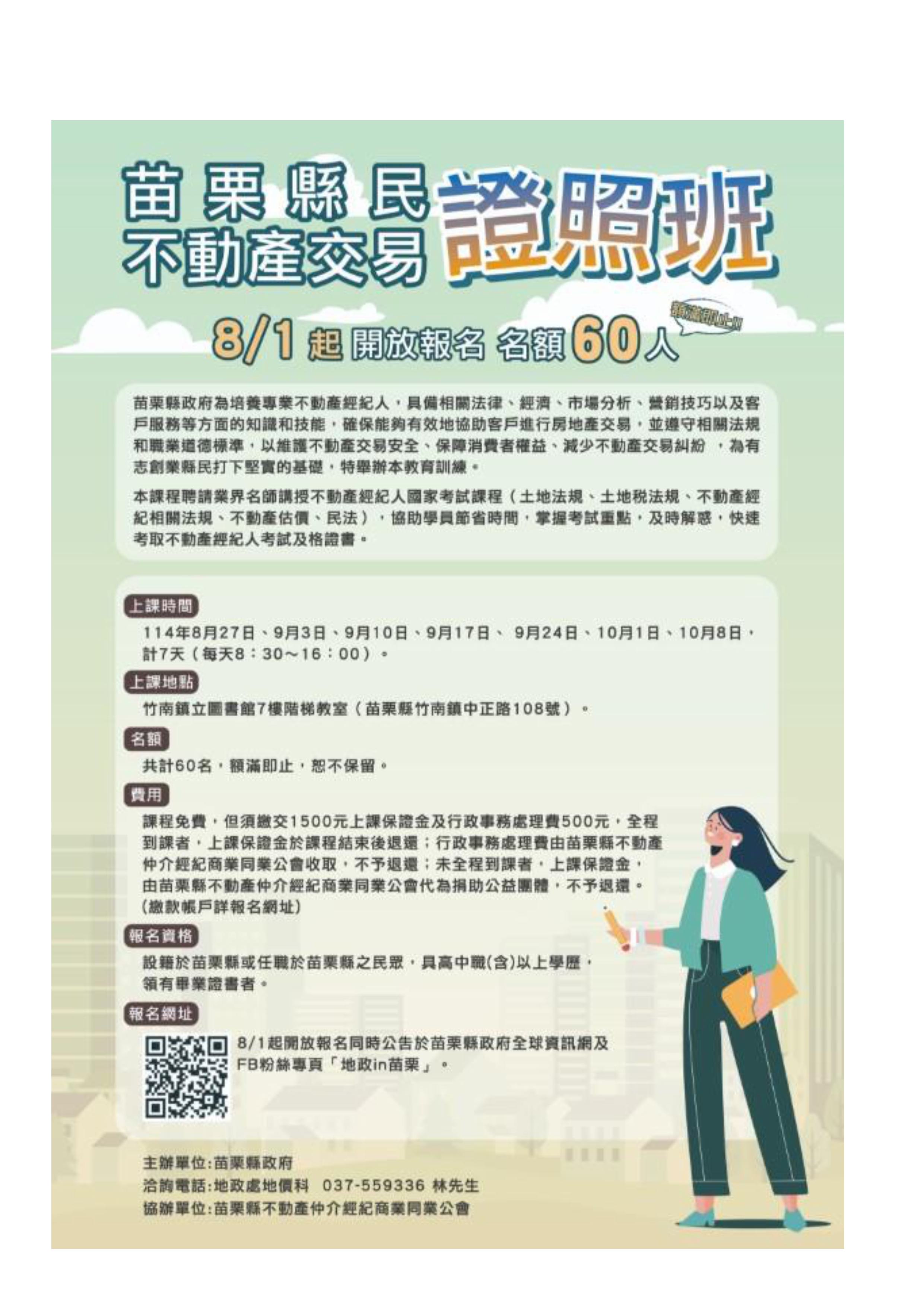 » 114.7.30114年度苗栗縣民不動產交易證照班開放報名