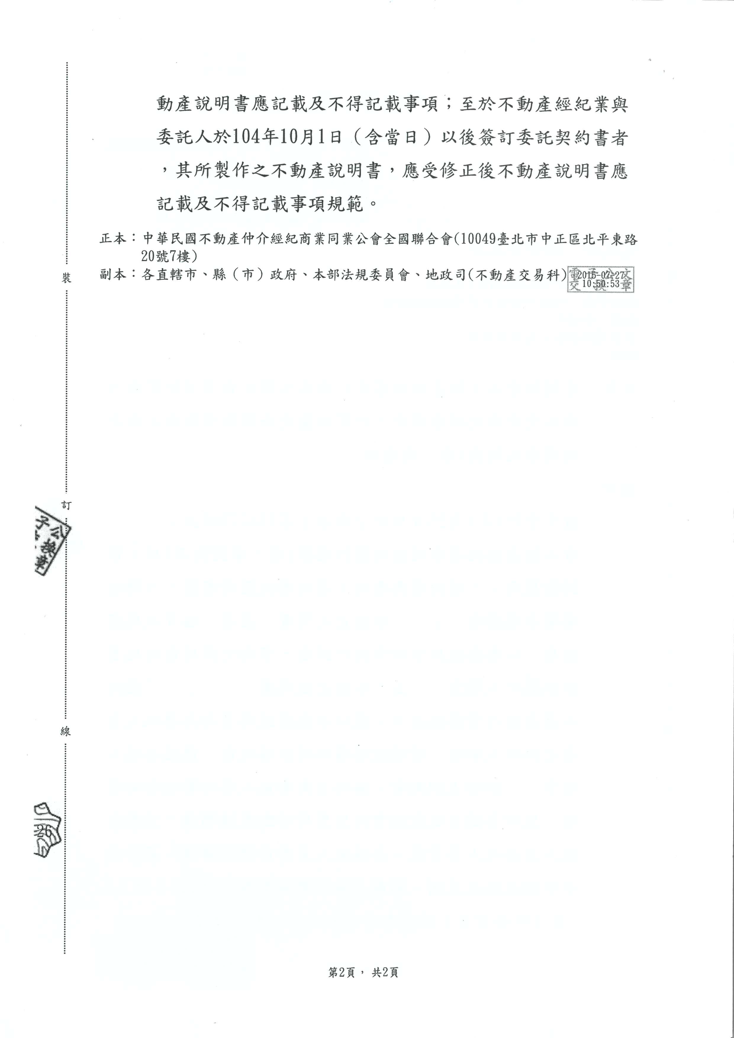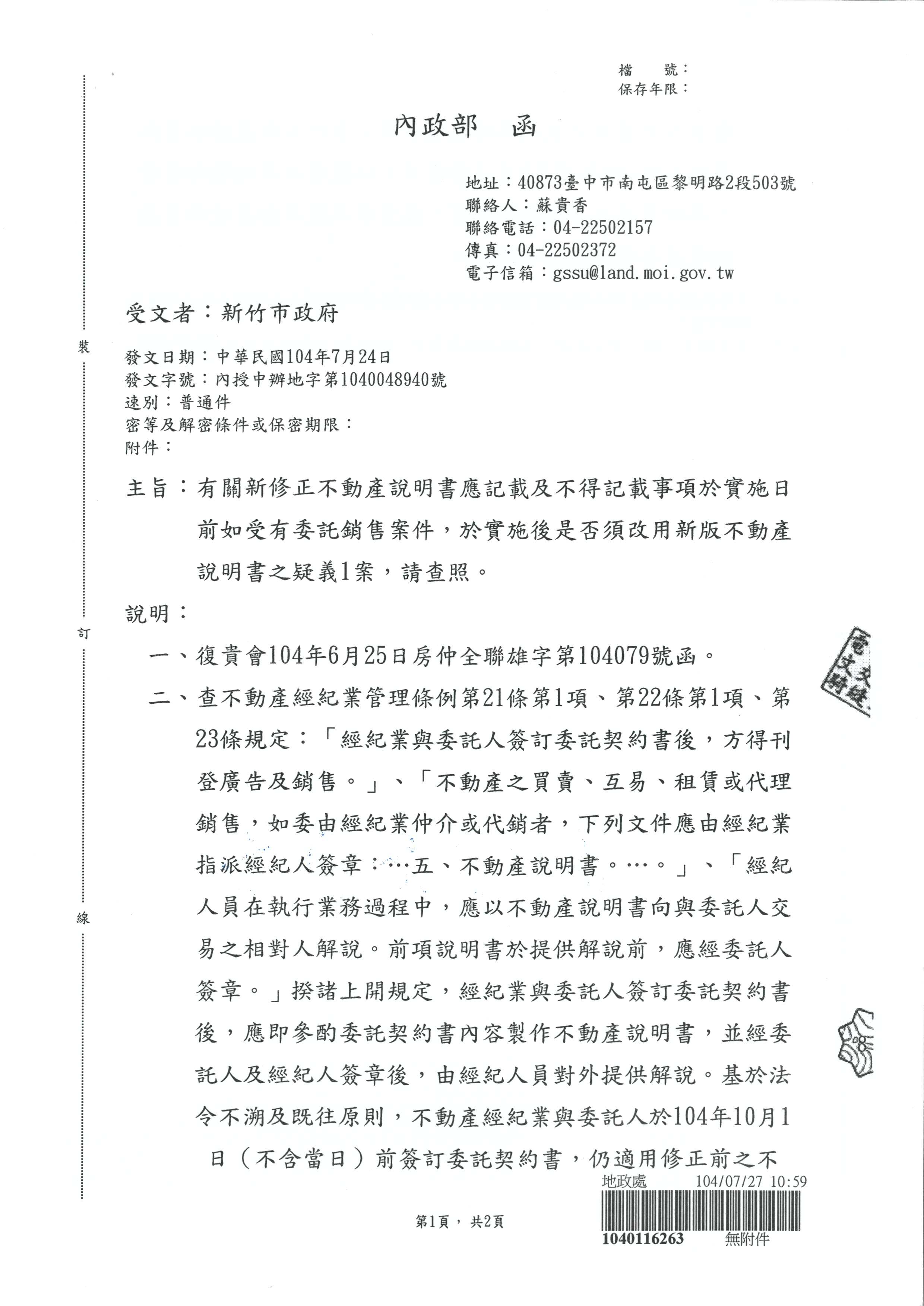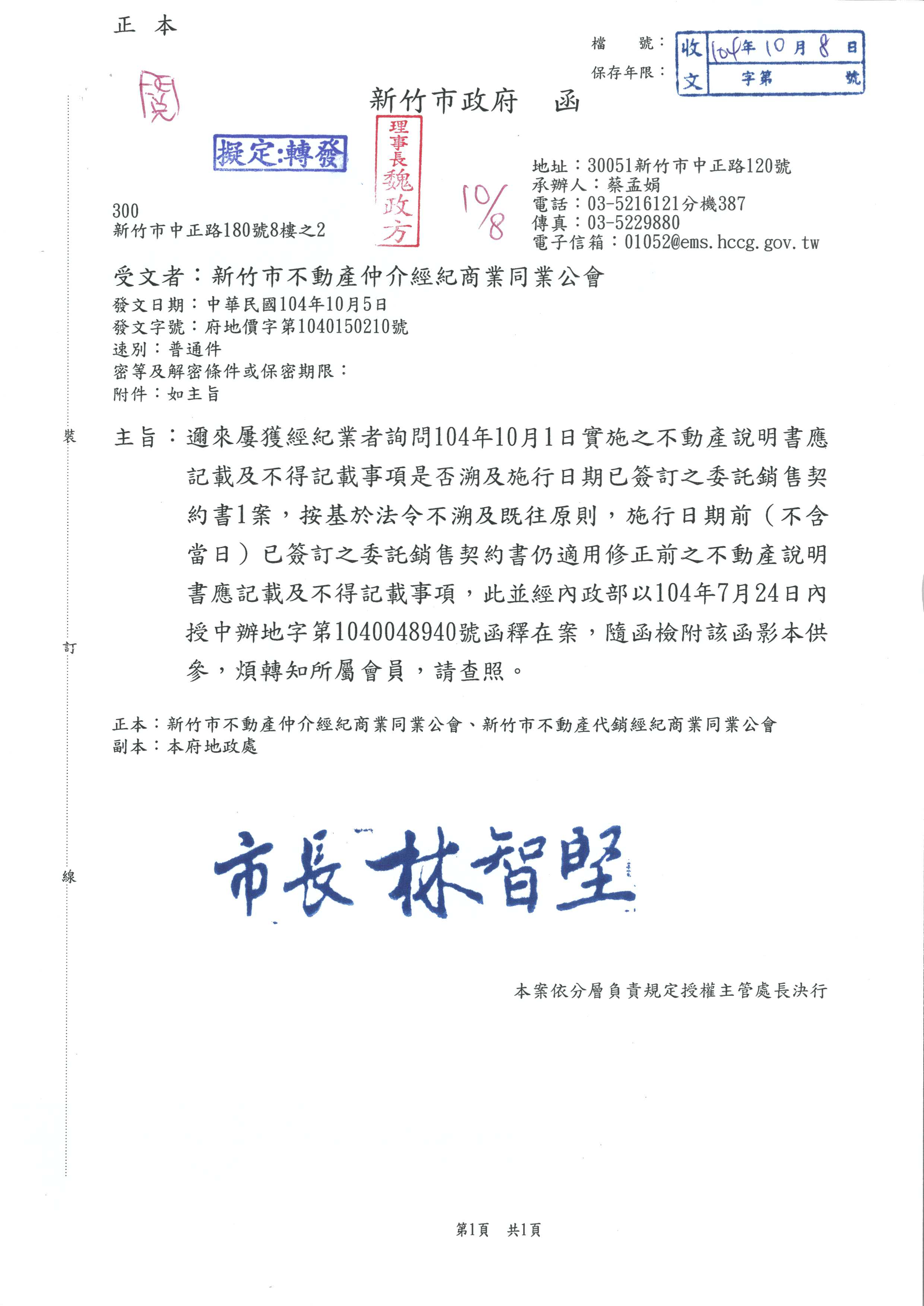 » 函轉新竹市政府104年10月1日實施之不動產說明書應記載及不得記載事項加否溯及施行日期已簽訂之委託銷售契約書