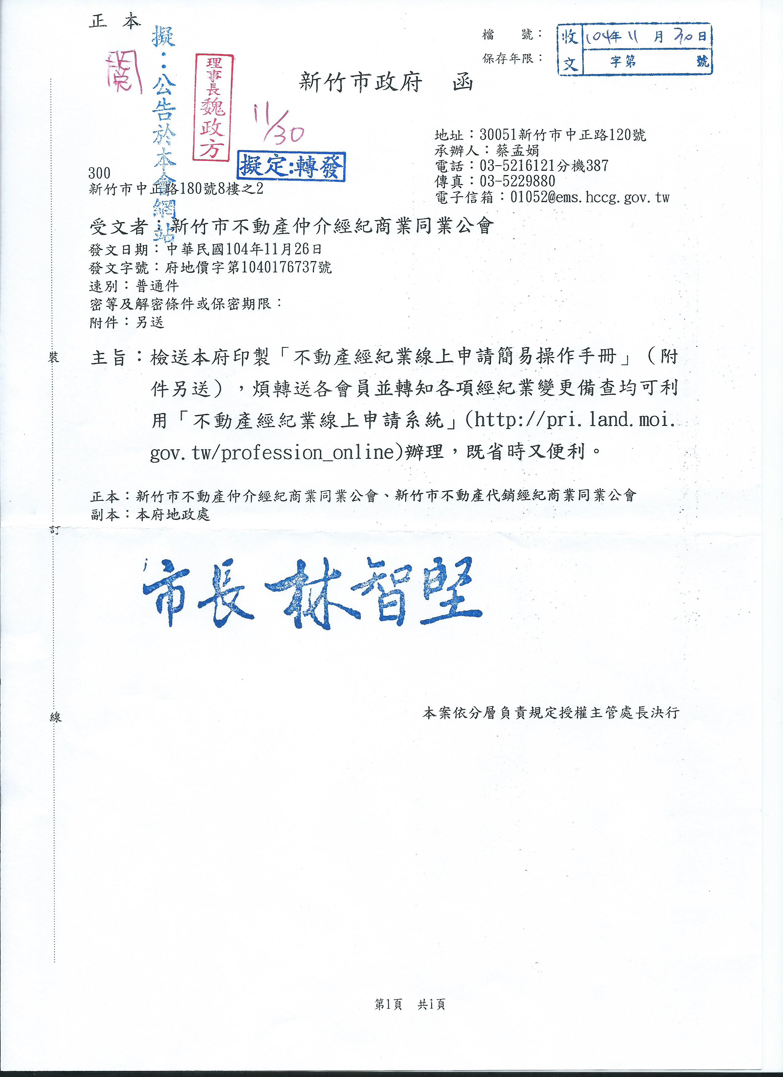 「不動產經紀業線上申請簡易操作手冊」於104年12月底統一寄發給會員公司