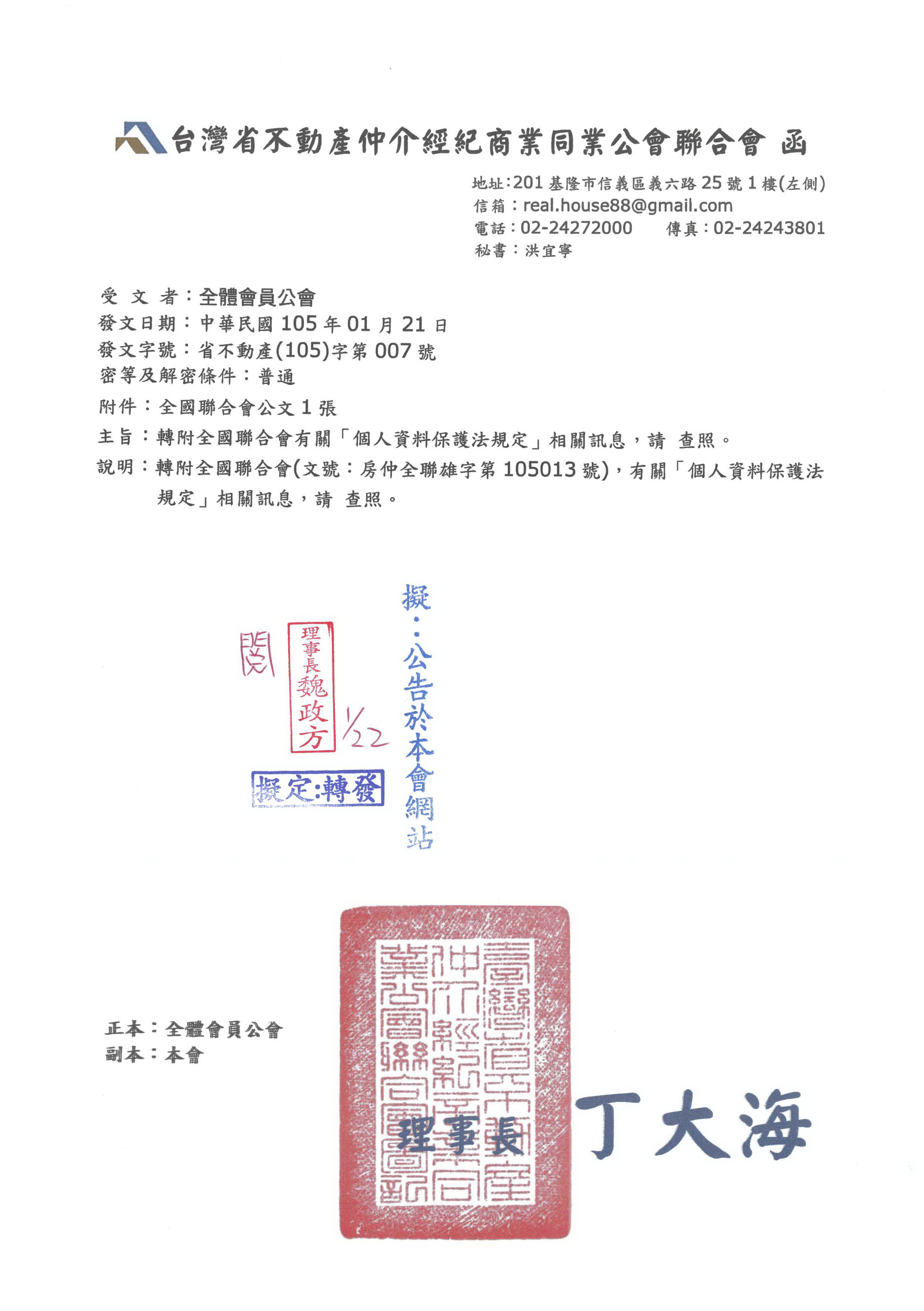 檔案下載(1050121(007)全體會員公會-轉附全國聯合會有關「個人資料保護法規定」相關訊息-附件.doc)