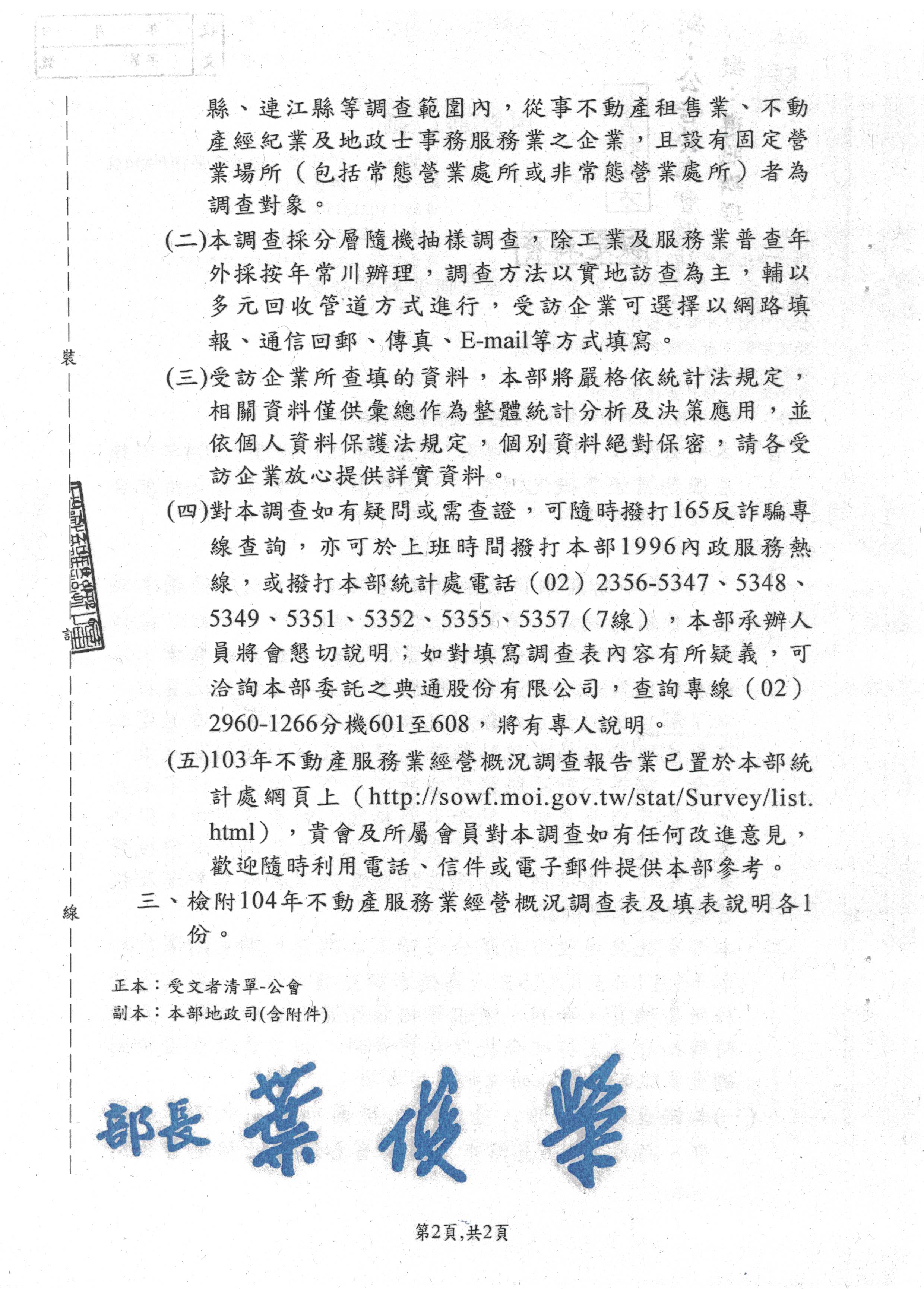 » 函轉內政部訂於105年6月1日至8月15日辦理「104年不動產服務業經營概況調查」,敬請轉知會員支持配合辦理
