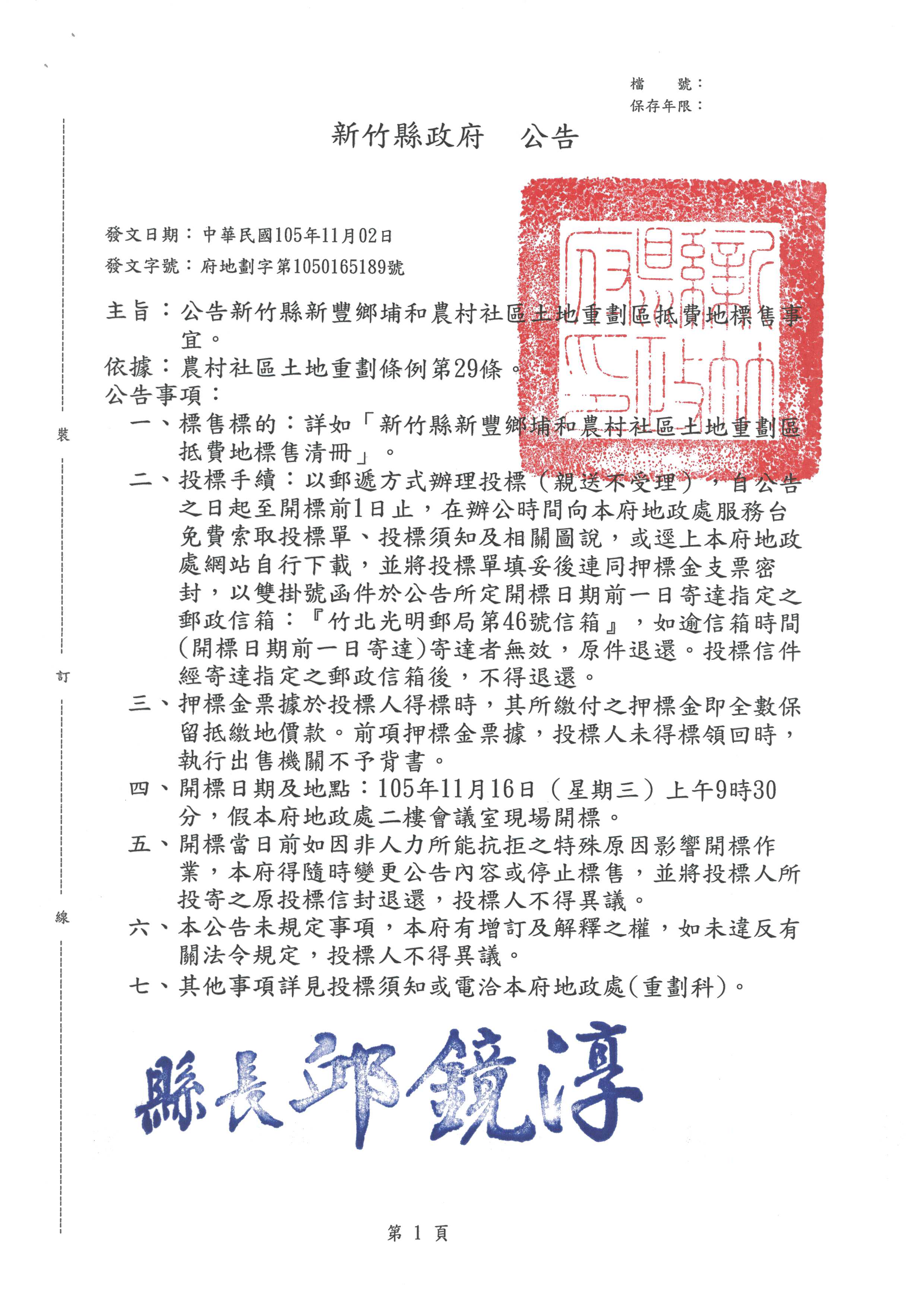 » 檢送新竹縣新豐鄉埔和農村社區土地重劃區抵費地標售公告、清冊、圖說及投標須知各乙份,惠請協助張貼於貴管公告處所公告周知,並將標售資訊刊登於機關網站。