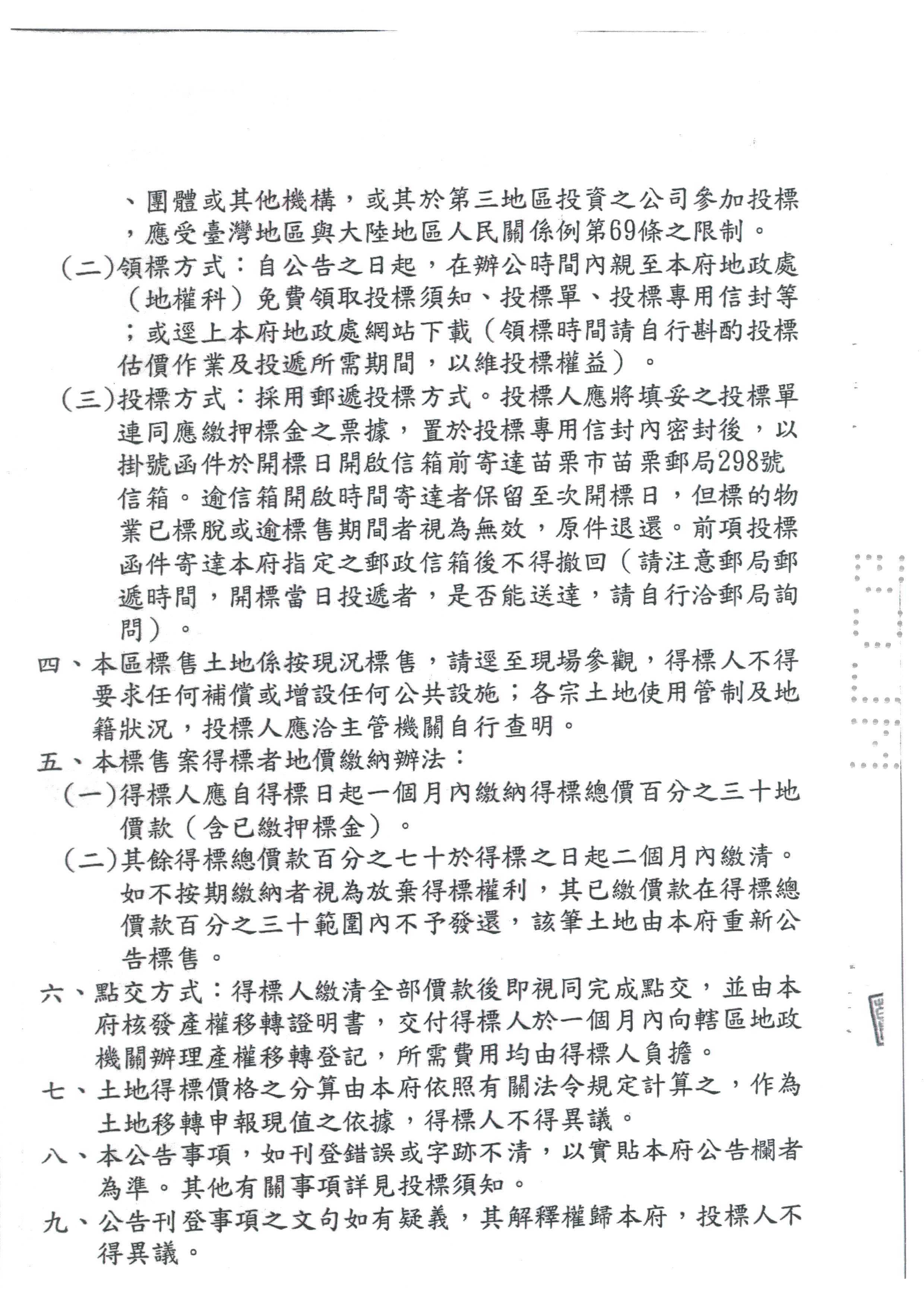 » 函轉苗栗縣政府檢送高速鐵路苗栗車站特定區區段徵收開發案住宅區土地標售公告文、投標須知、標售清冊及位置圖各1份