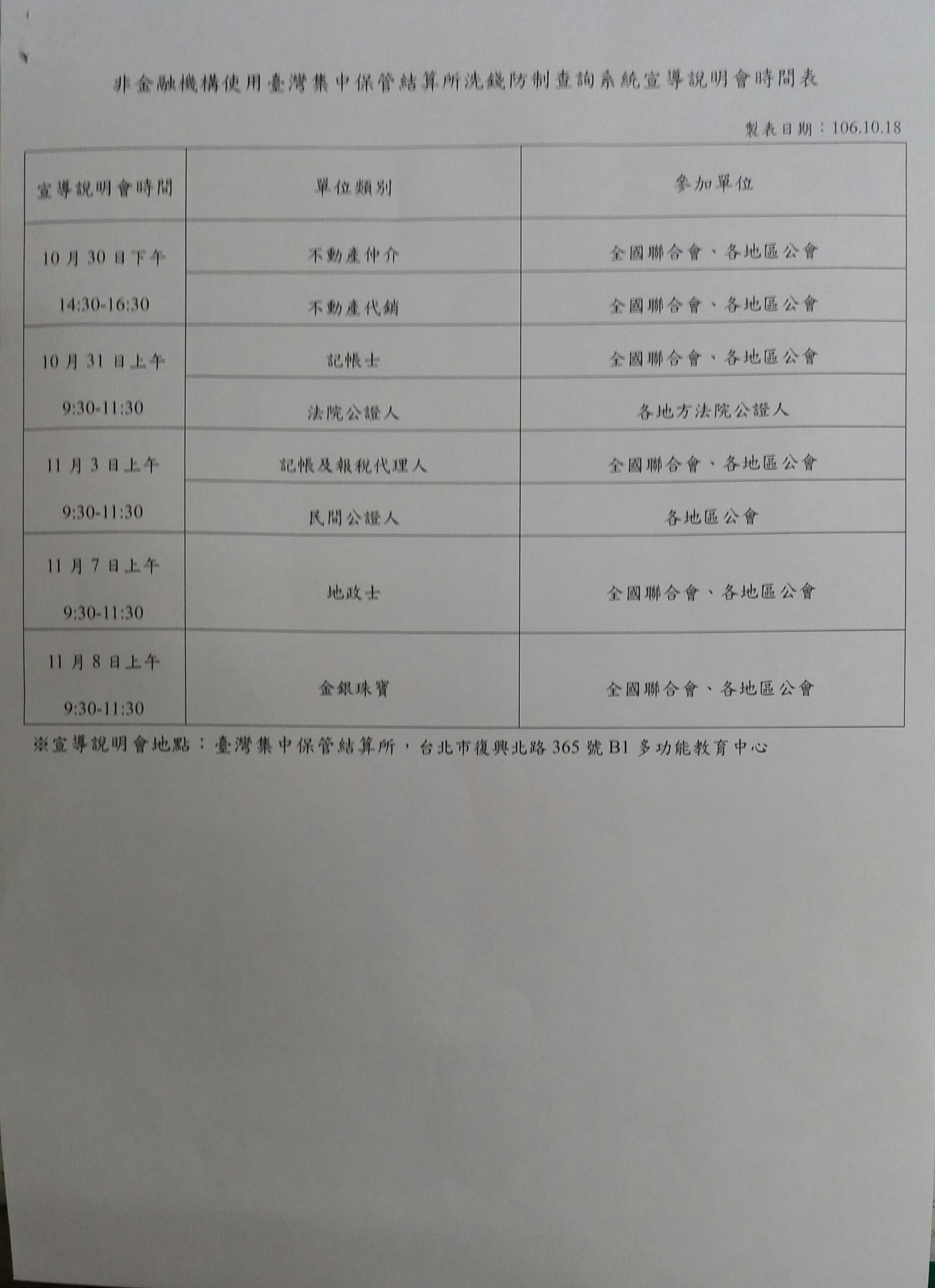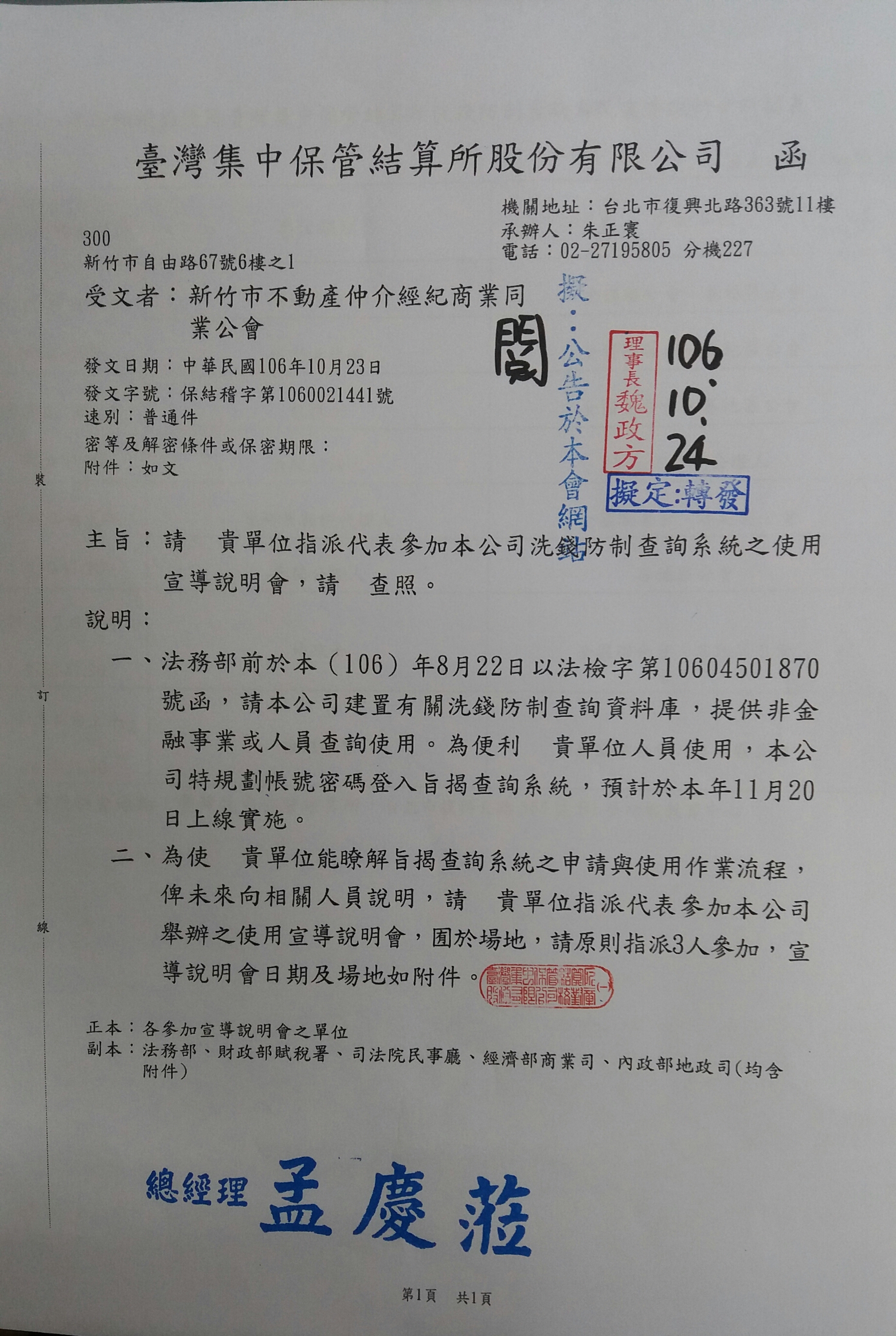 » 函轉台灣集中保管結算所股份有限公司請貴單位指派代表參加洗錢防制查詢系統之使用宣導說明會