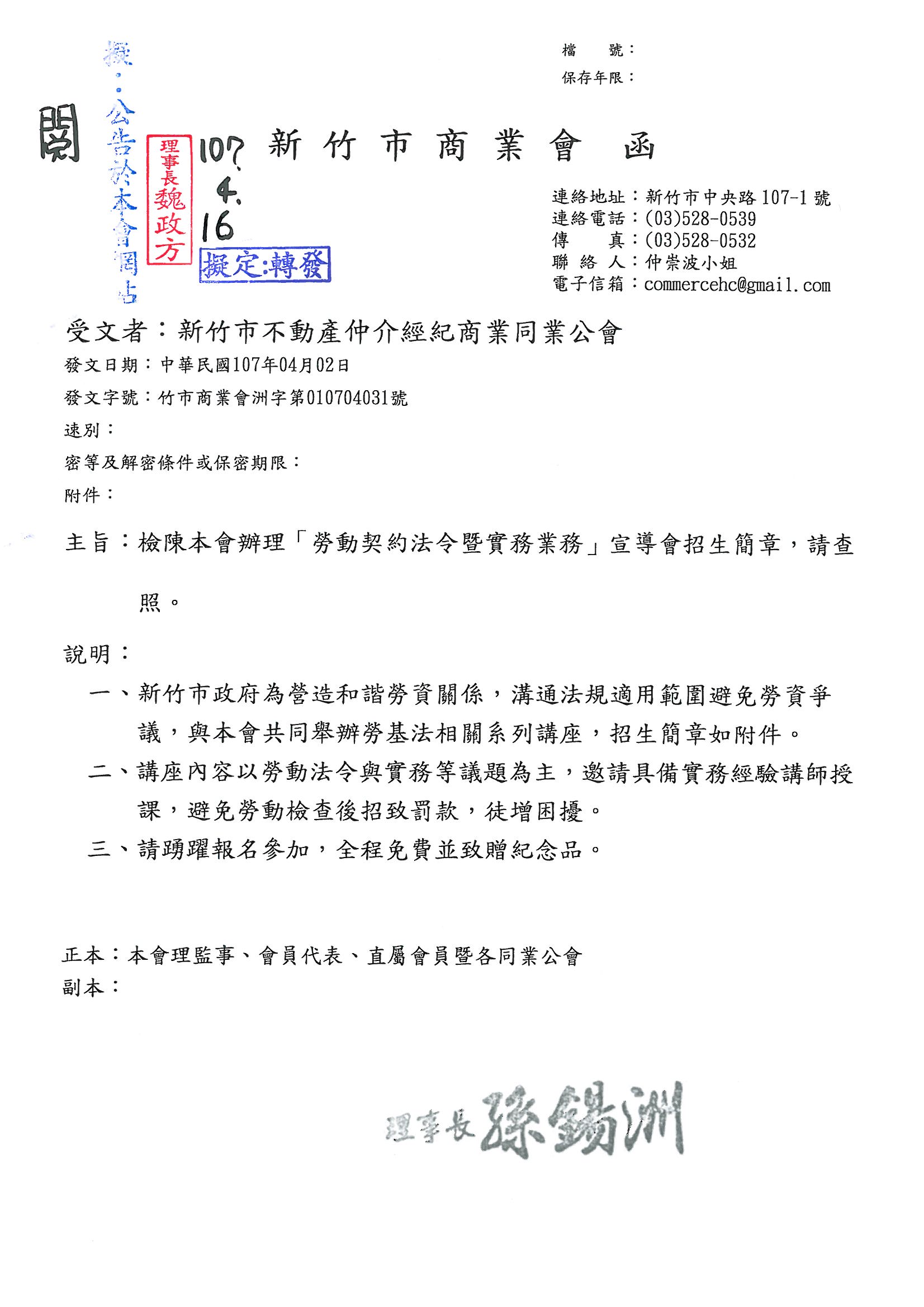 » 函轉新竹市商業會辦理「勞動契約法令暨實務業務」宣導會招生簡章,請查照