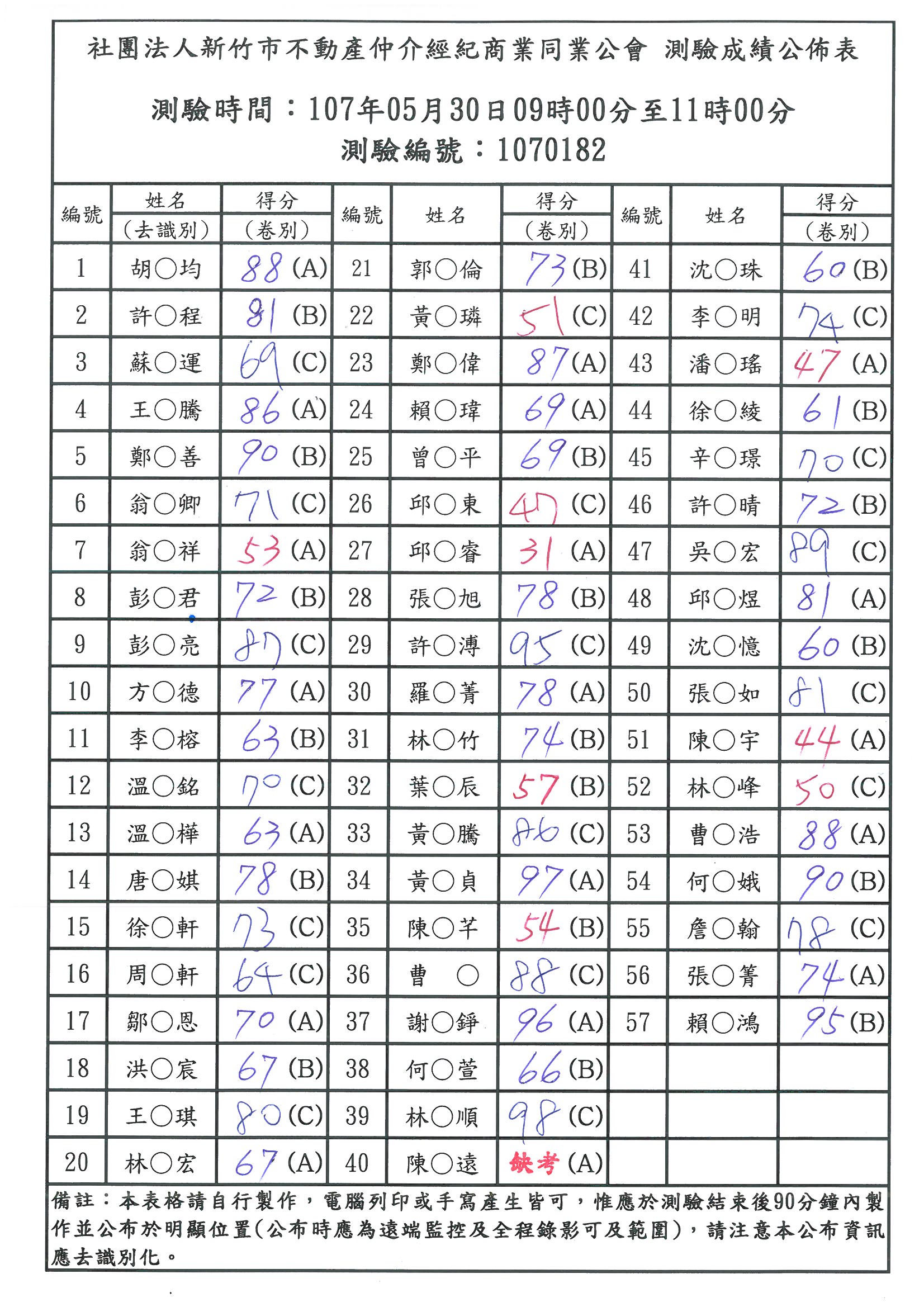 » 107年05月30日測驗成績公佈