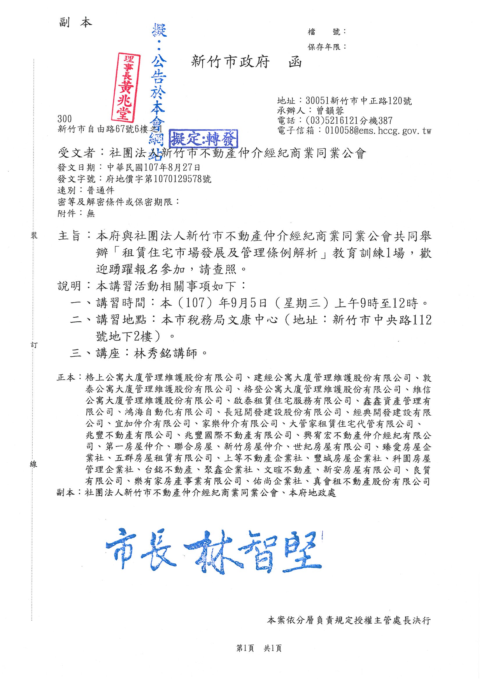 » 107年9月5日新竹市政府與本會將共同舉辦「租賃住宅市場發展及管理條例分析」教育訓練1場,歡迎踴躍報名參加,請查照