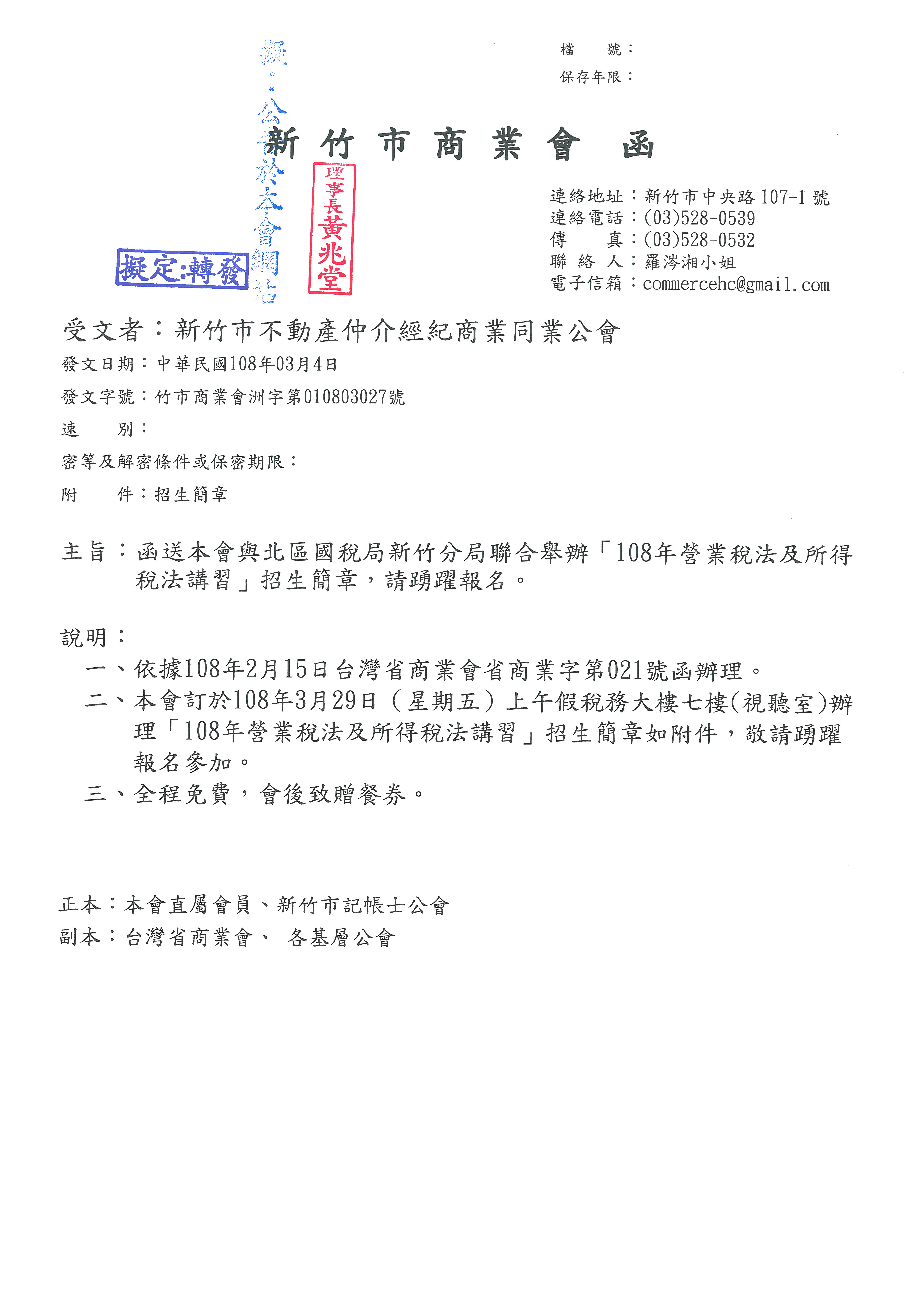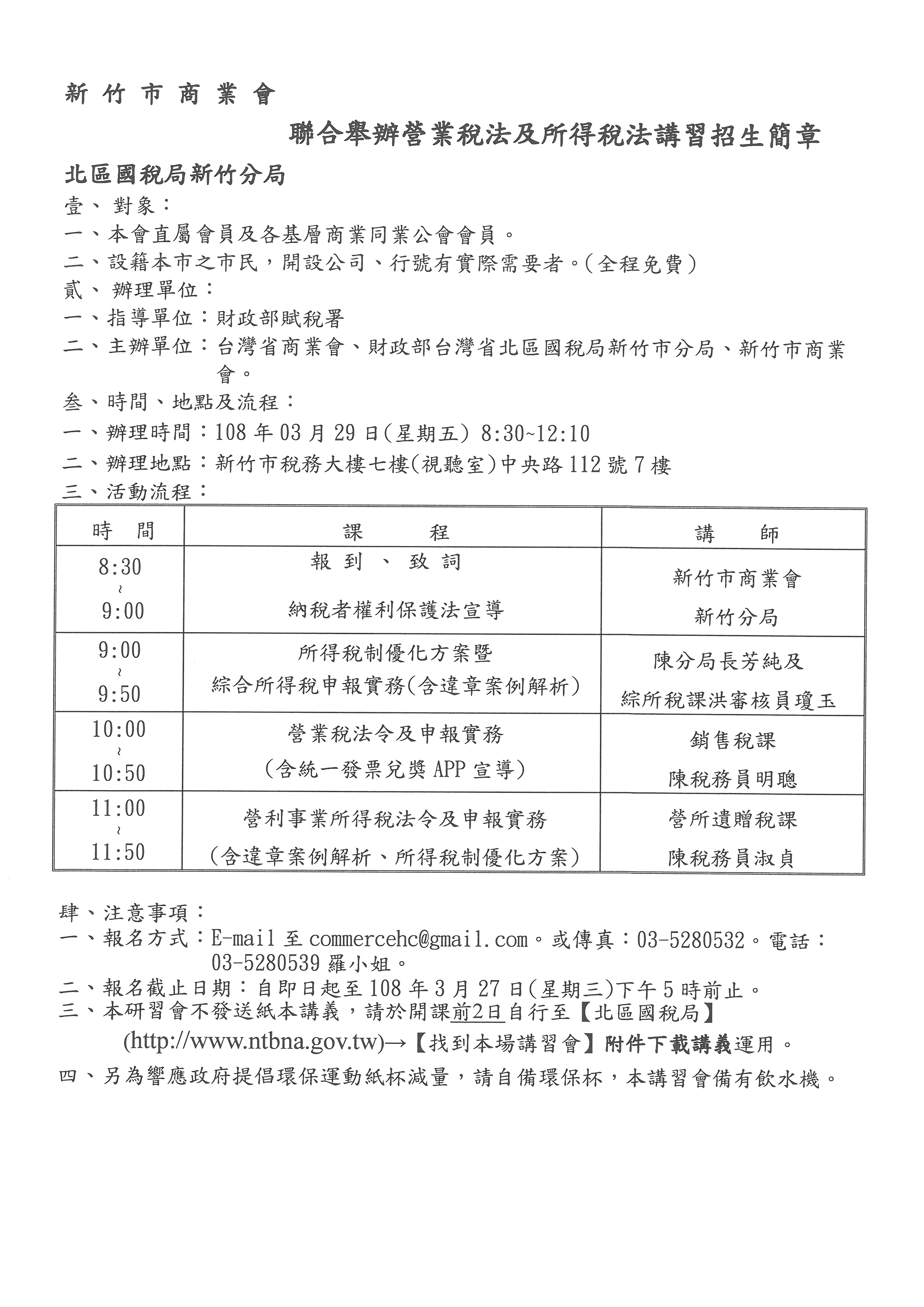 » 函轉新竹市商業會與北區國稅局新竹分局聯合舉辦108年營業稅法及所得稅法講習招生簡章,請踴躍報名