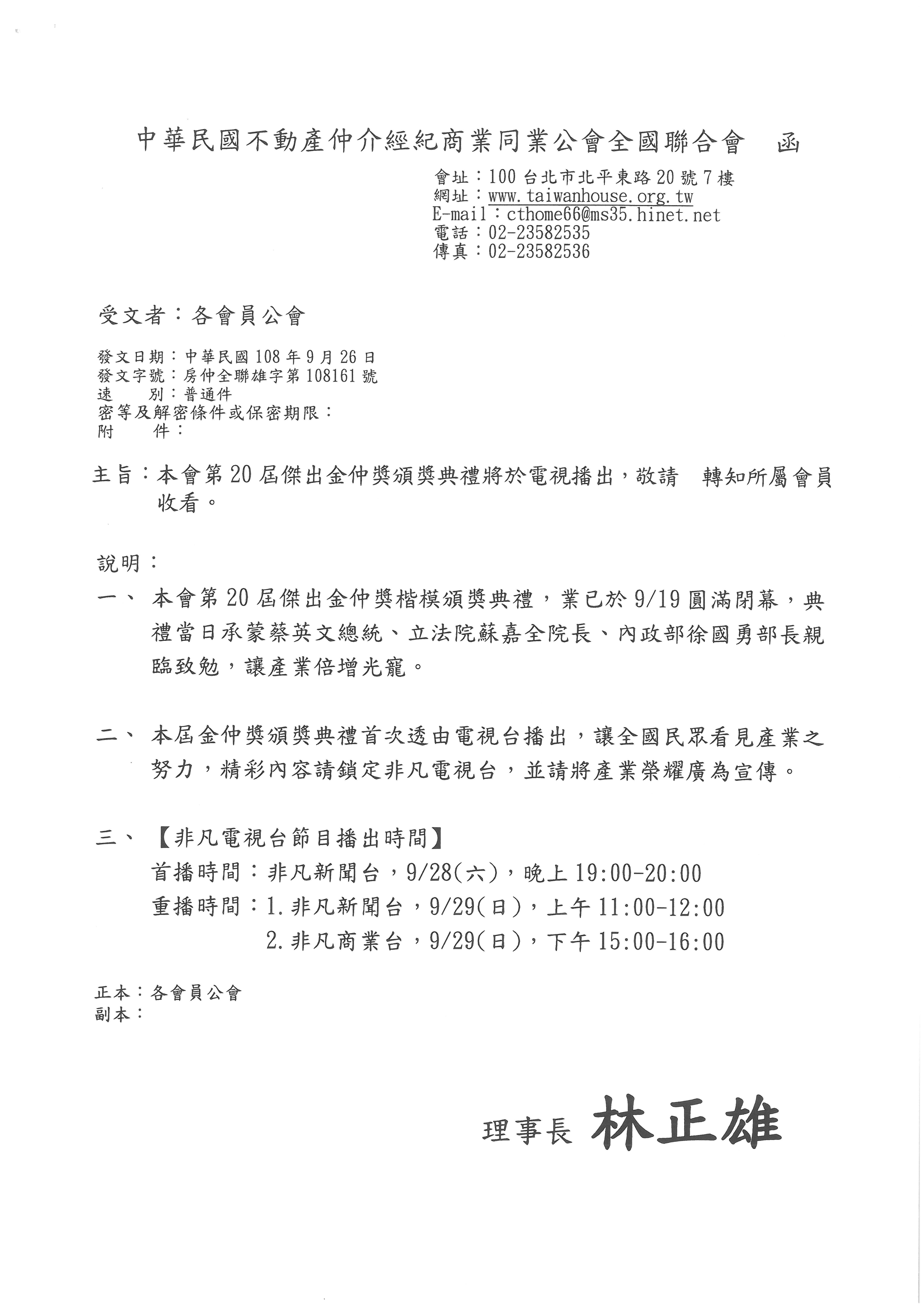 » 函轉省聯會關於第20屆傑出金仲獎典禮將於電視播出,敬請會員公司收看