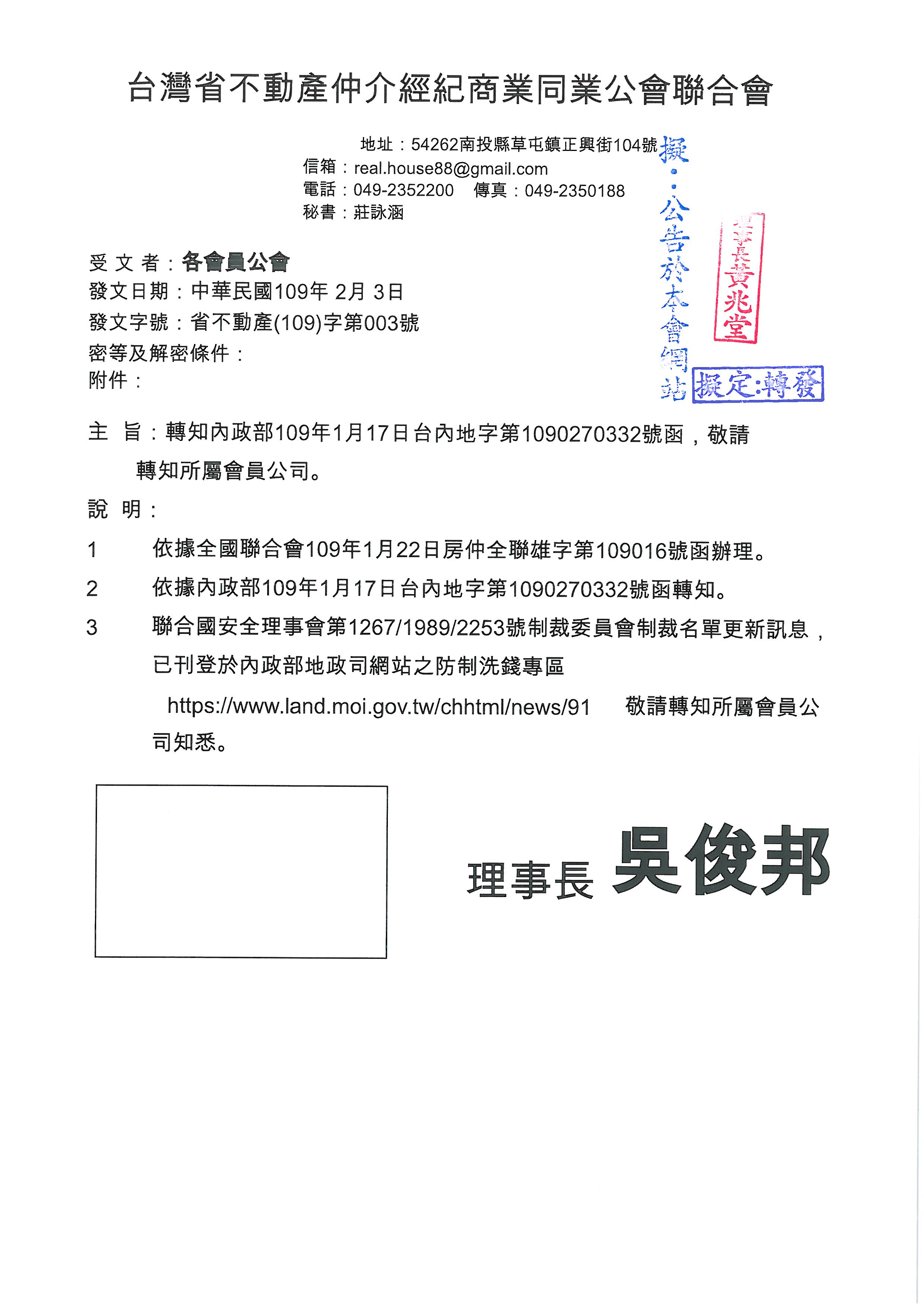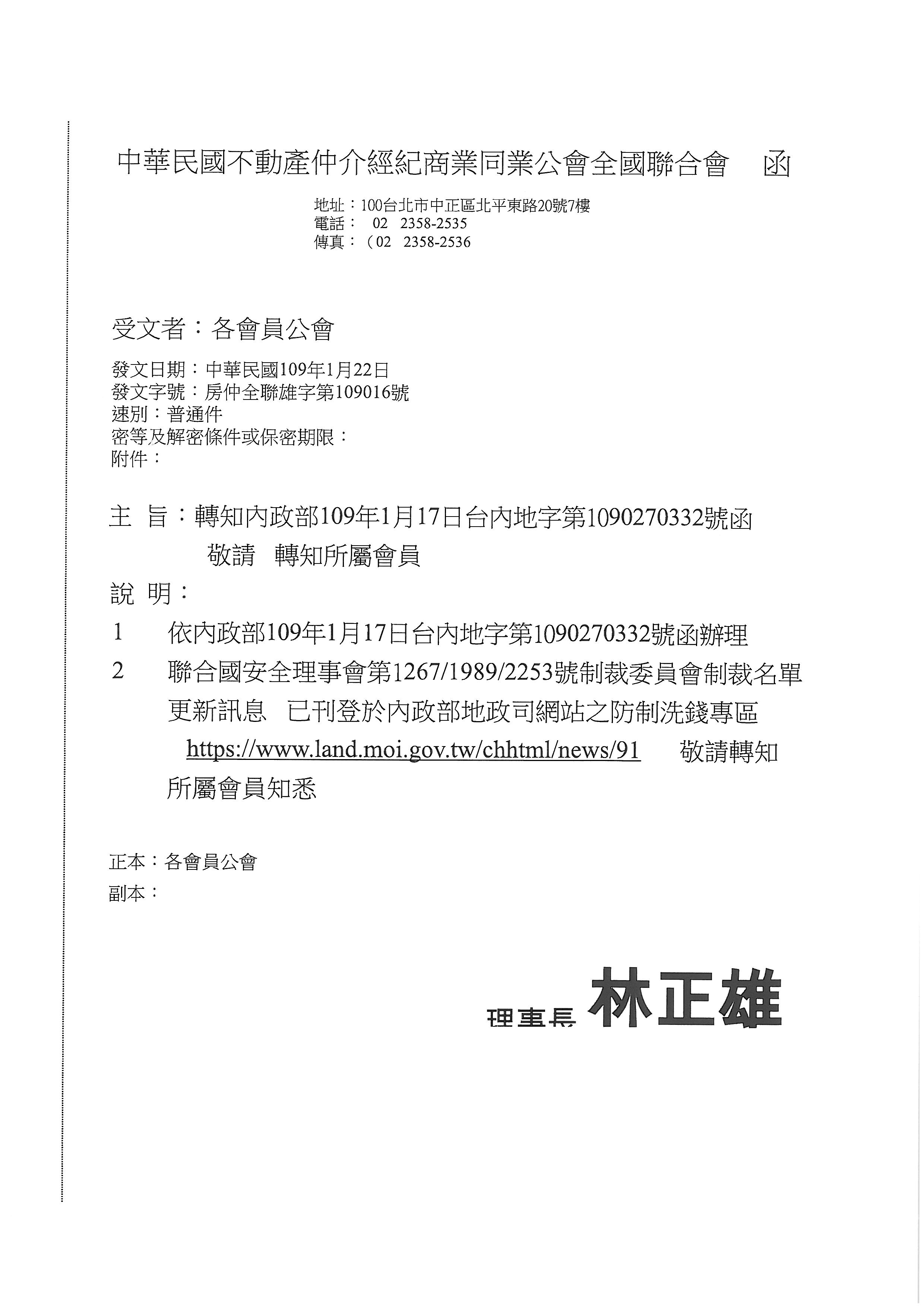 » 函轉省聯會第003號公文-含附件1份(轉知聯合國安理會制裁名單更新)