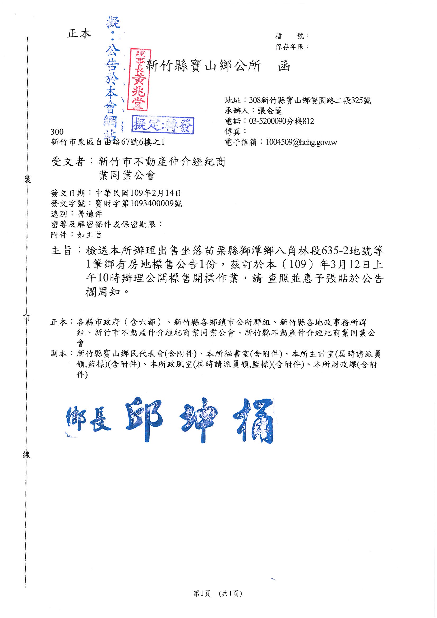 » 函轉新竹縣寶山鄉公所辦理出售坐落苗栗縣獅潭鄉八角林段635-2地號等1筆鄉有房地標售公告1份,茲定於109年3月12日上午10時辦理公開標售開標作業,敬請查照!