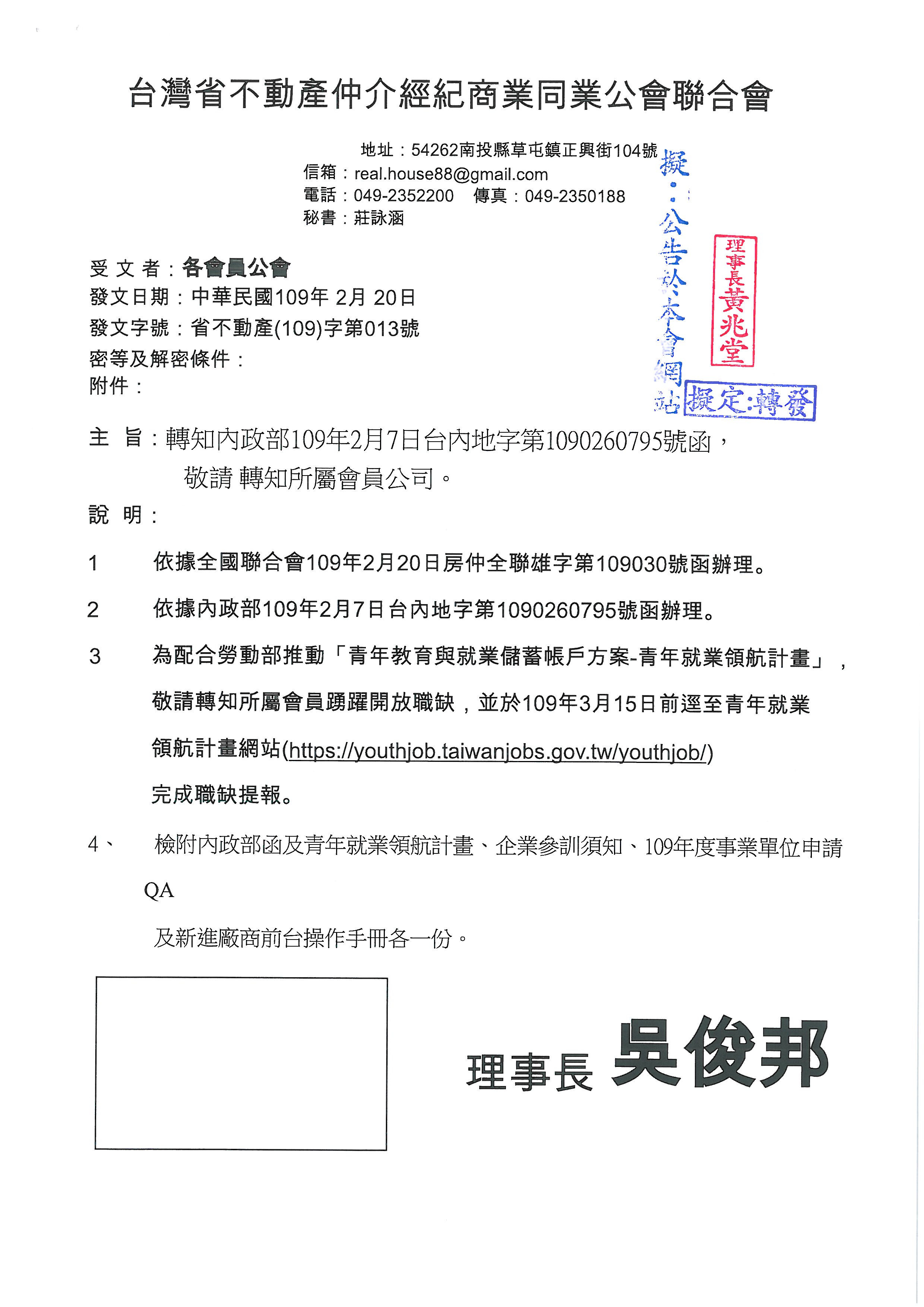 » 函轉省聯會第013號公文-含附件2份(轉知內政部配合營動部推動「青年就業領航計畫」)