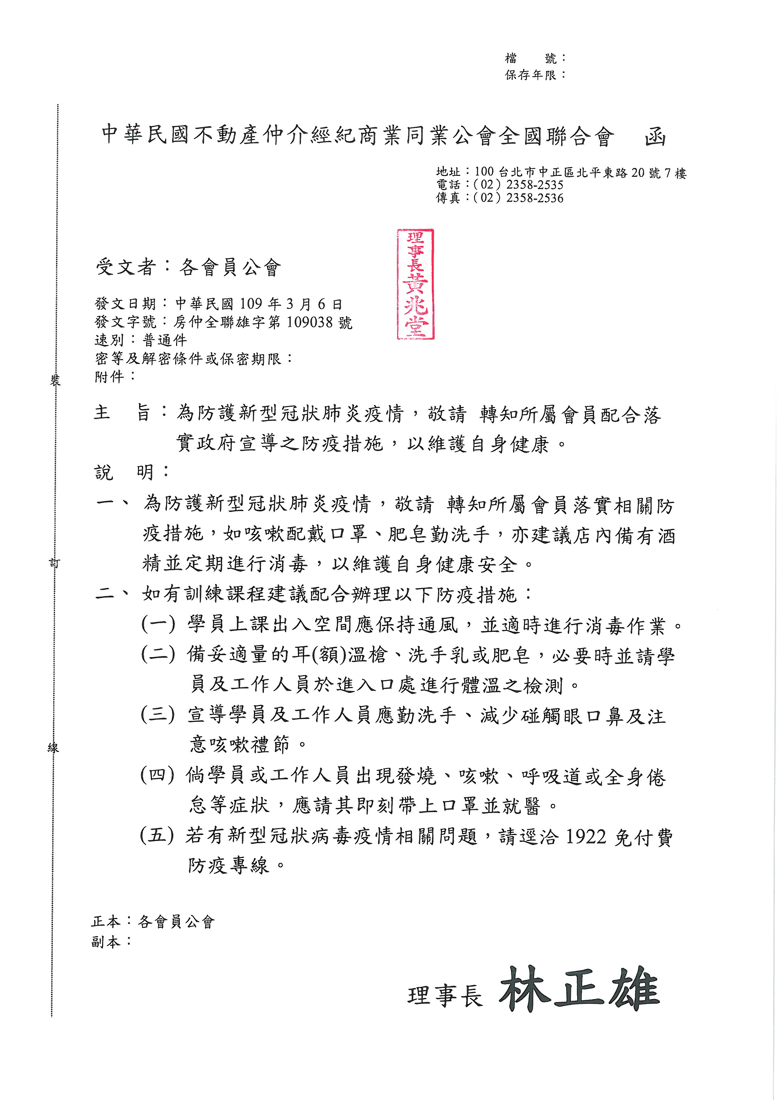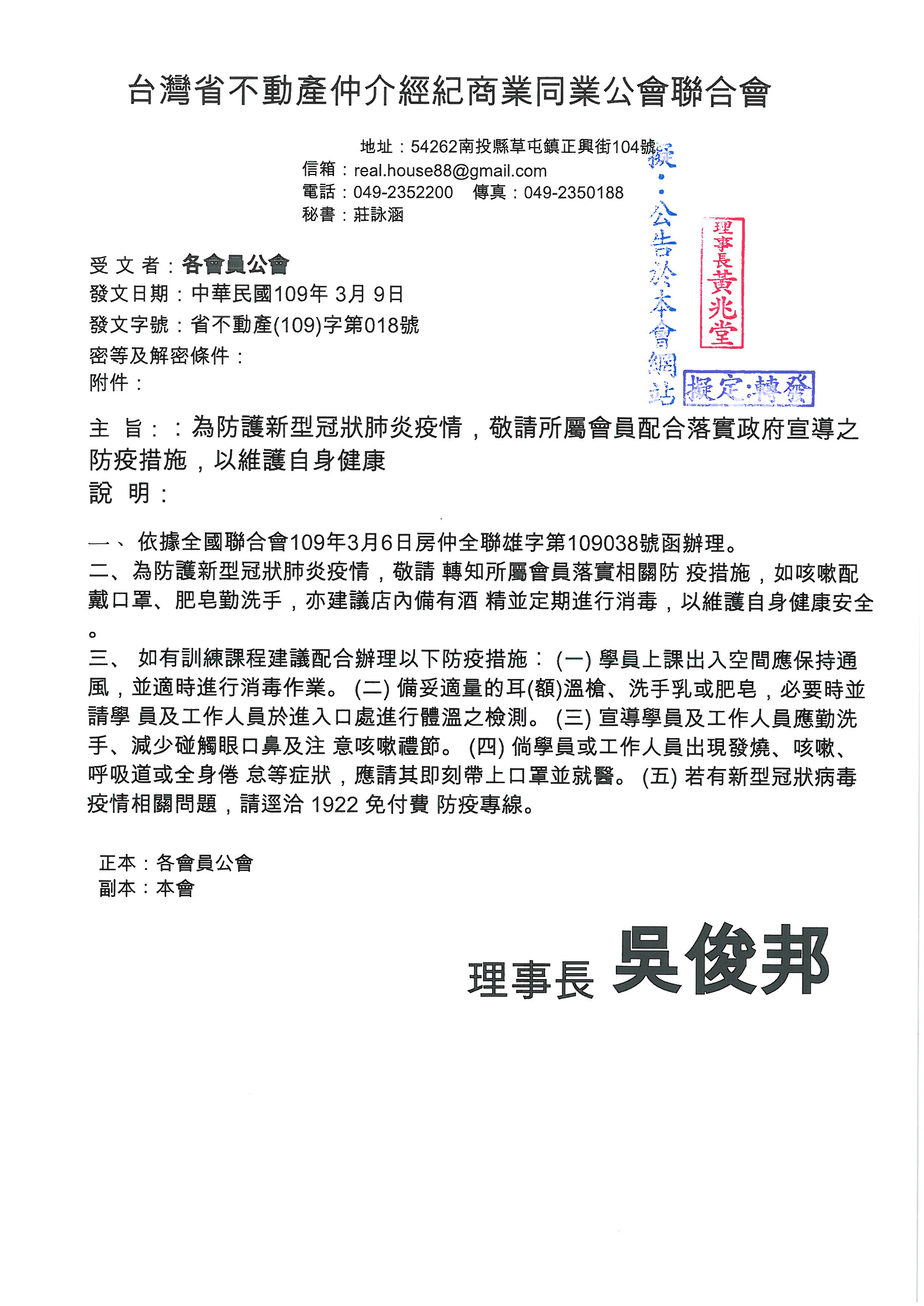 » 函轉省聯會第018號公文-含附件1份轉知所屬會員配合落實政府宣導之防疫措施,以維護自身健康。
