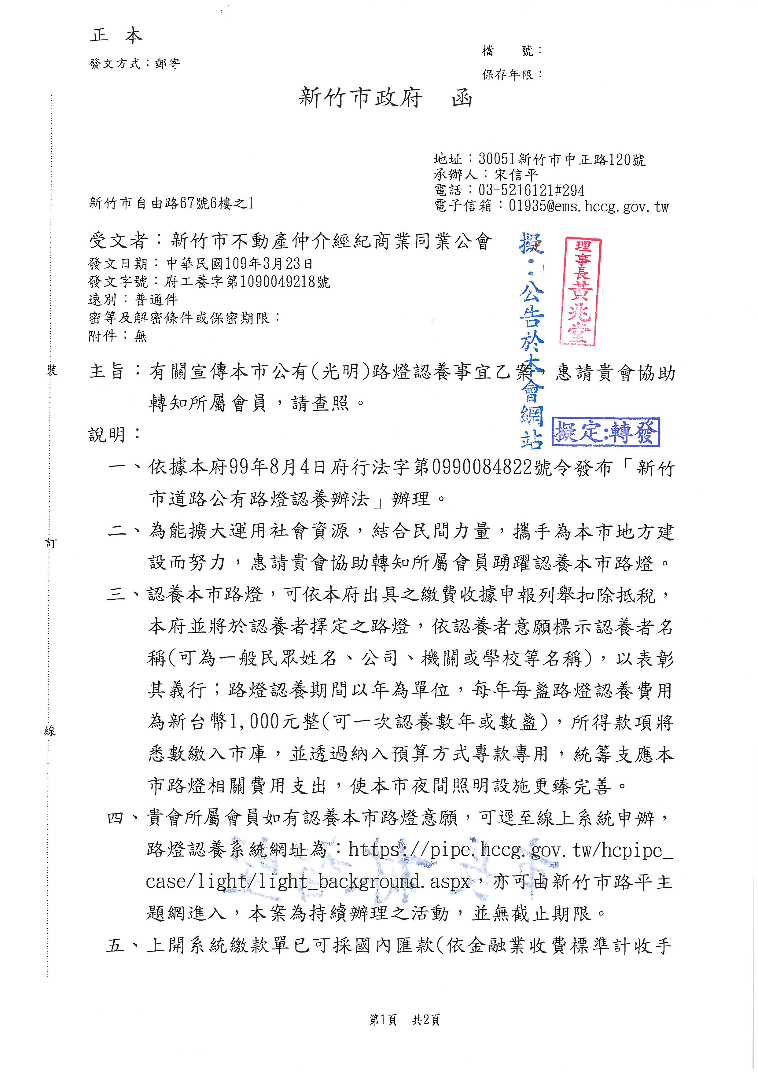 » 函轉新竹市政府有關宣傳本市公有(光明)路燈認養事宜乙案,敬請查照!
