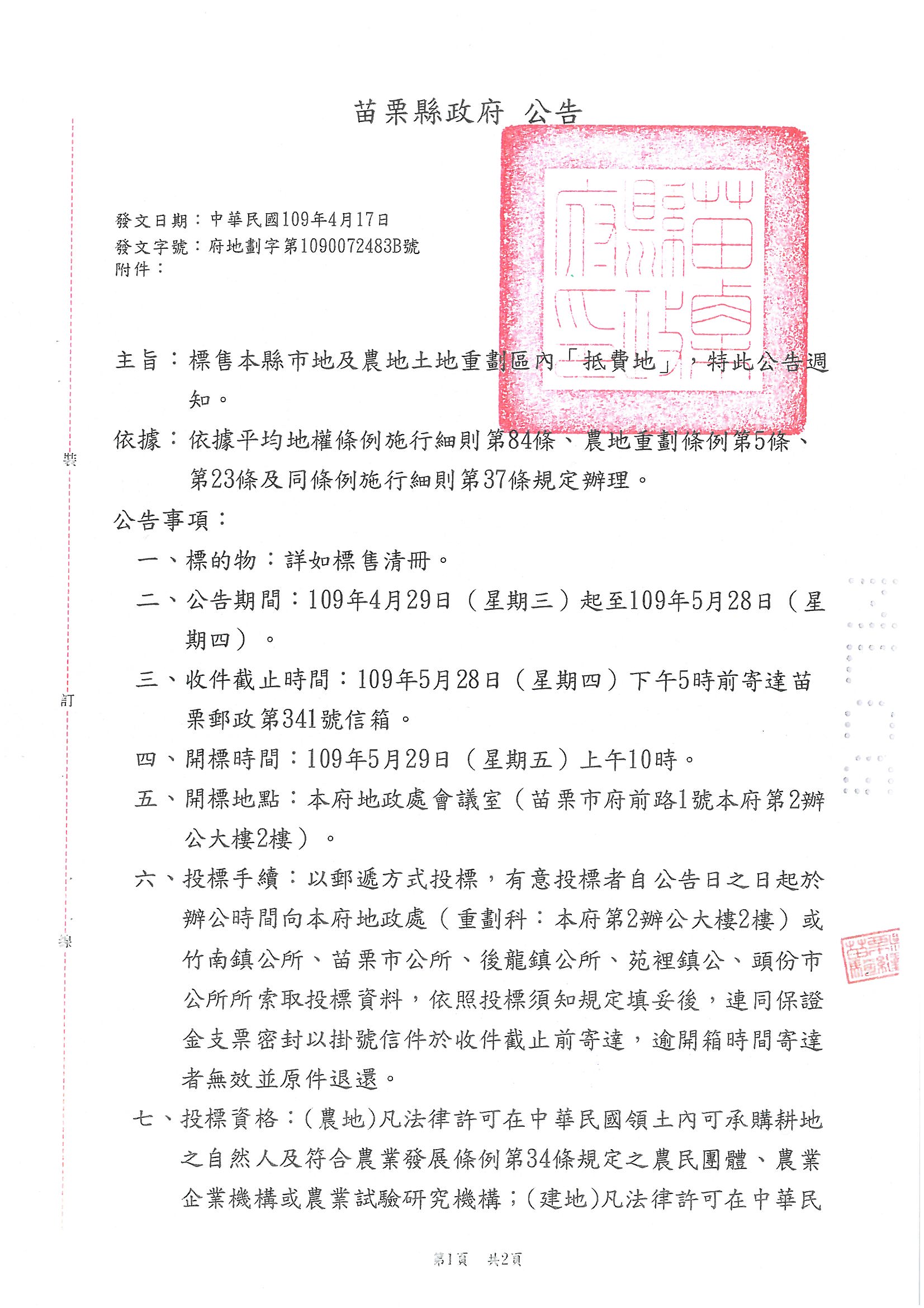 » 函轉苗栗縣政府檢送109年5月29日辦理苗栗縣各重劃區抵費地標售資訊,敬請查照!