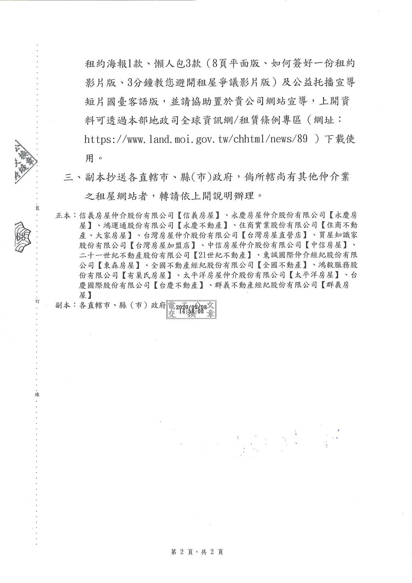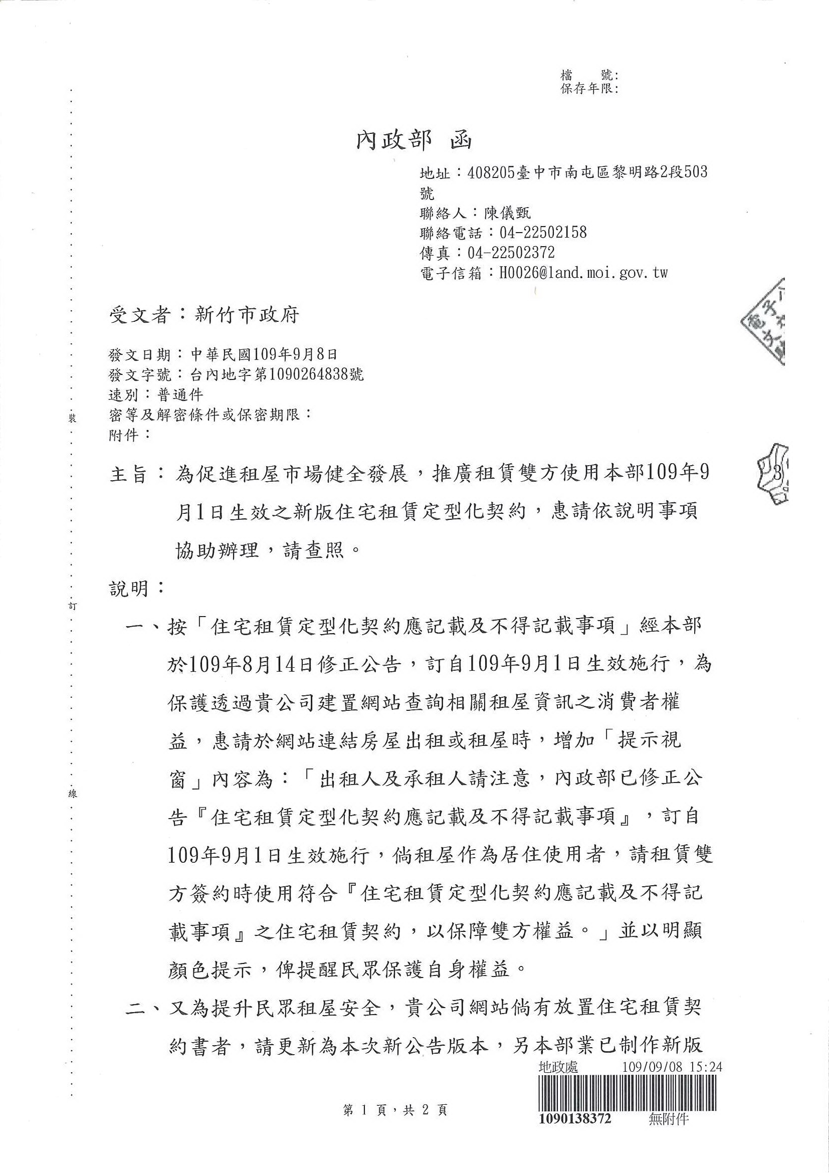 » 函轉內政部有關協助推廣新版住宅租賃定型化契約1案,敬請查照