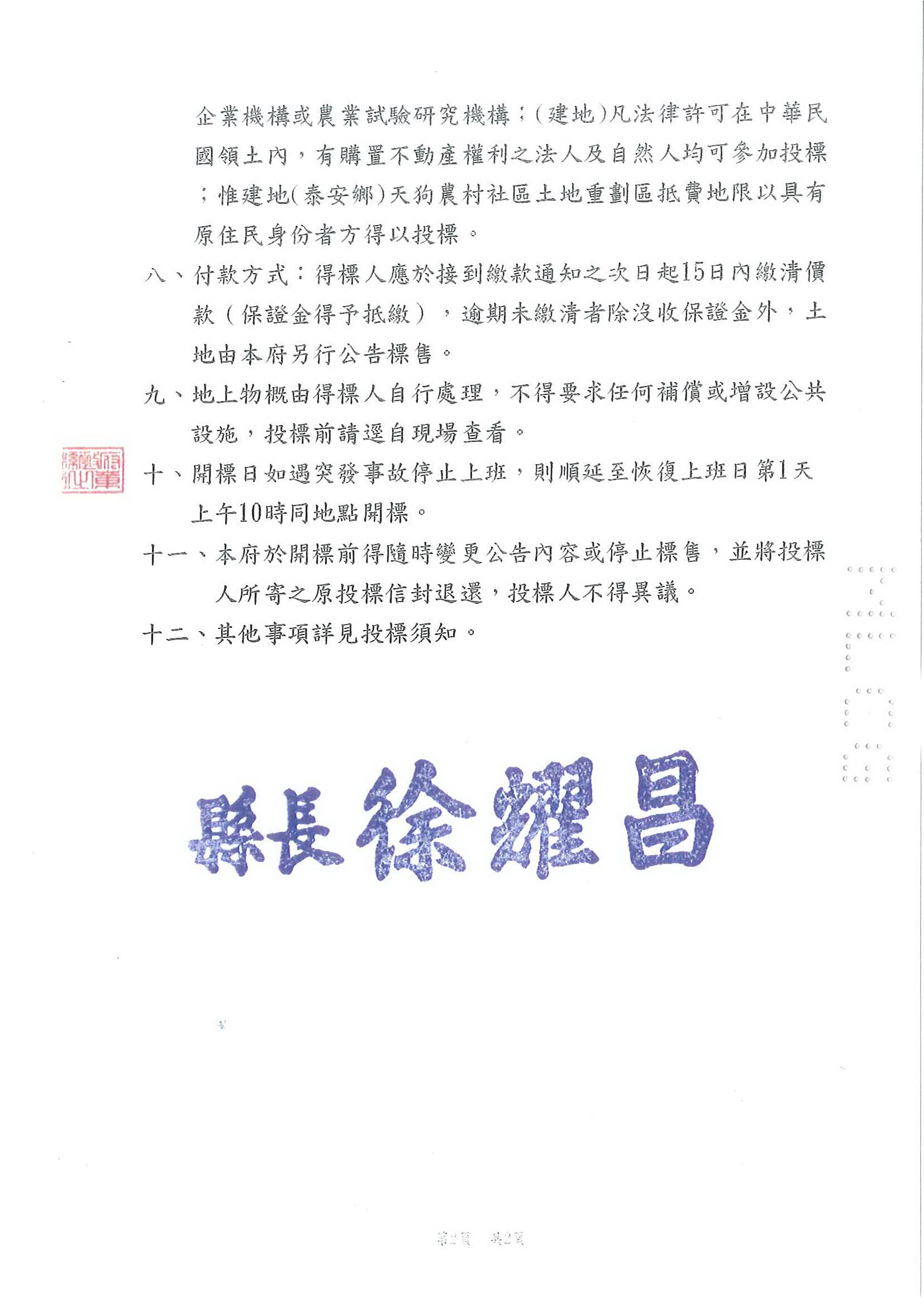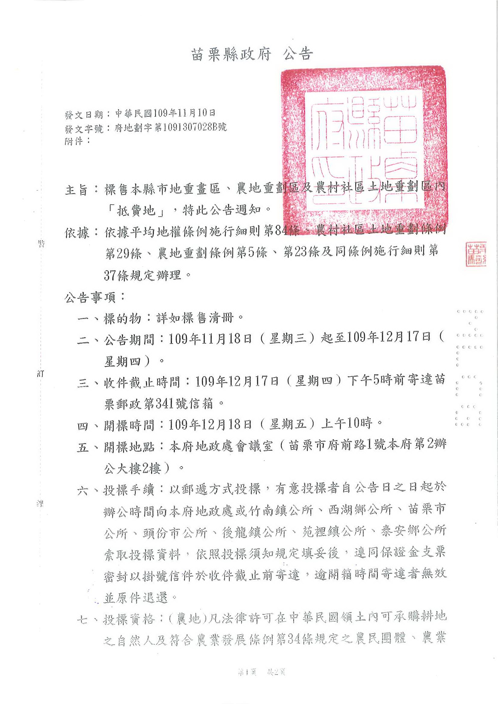 » 函轉苗栗縣政府檢送109年12月18日(星期五)辦理苗栗縣各重劃區抵費地標售資訊.敬請查照!