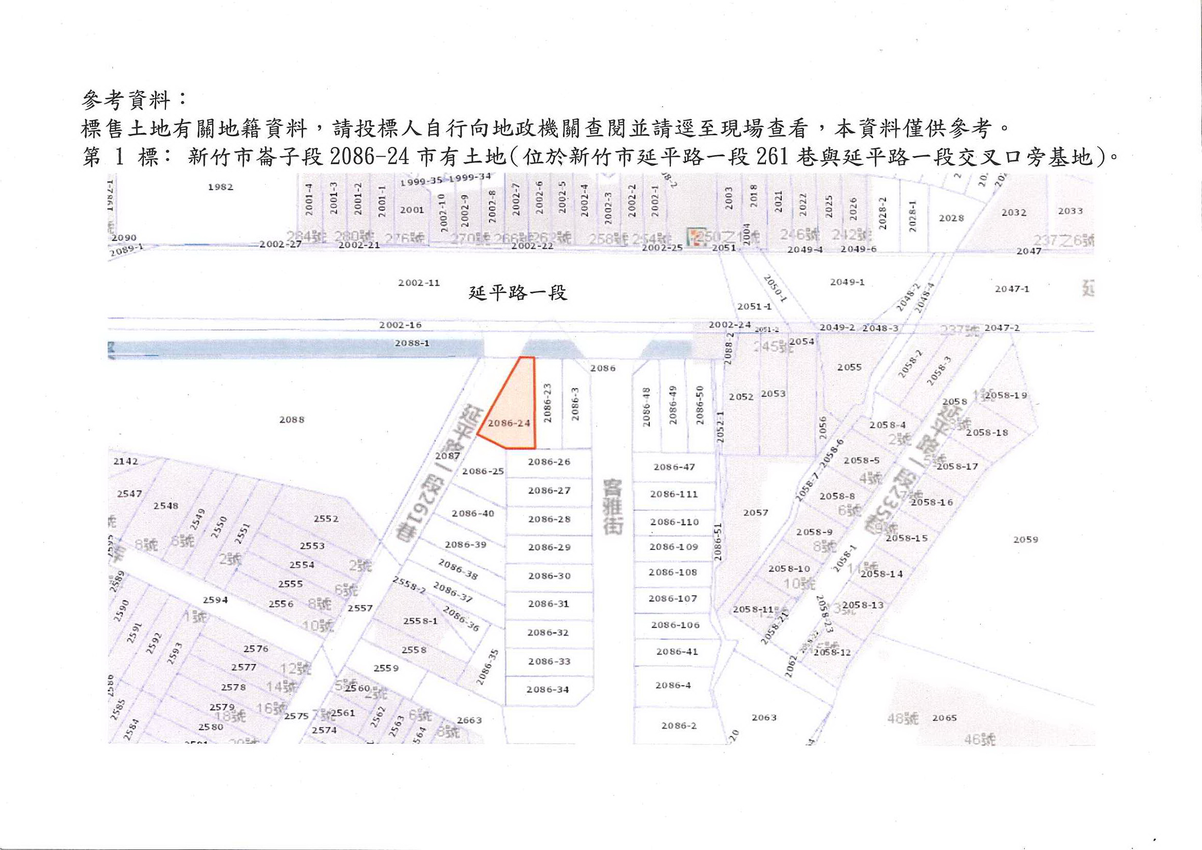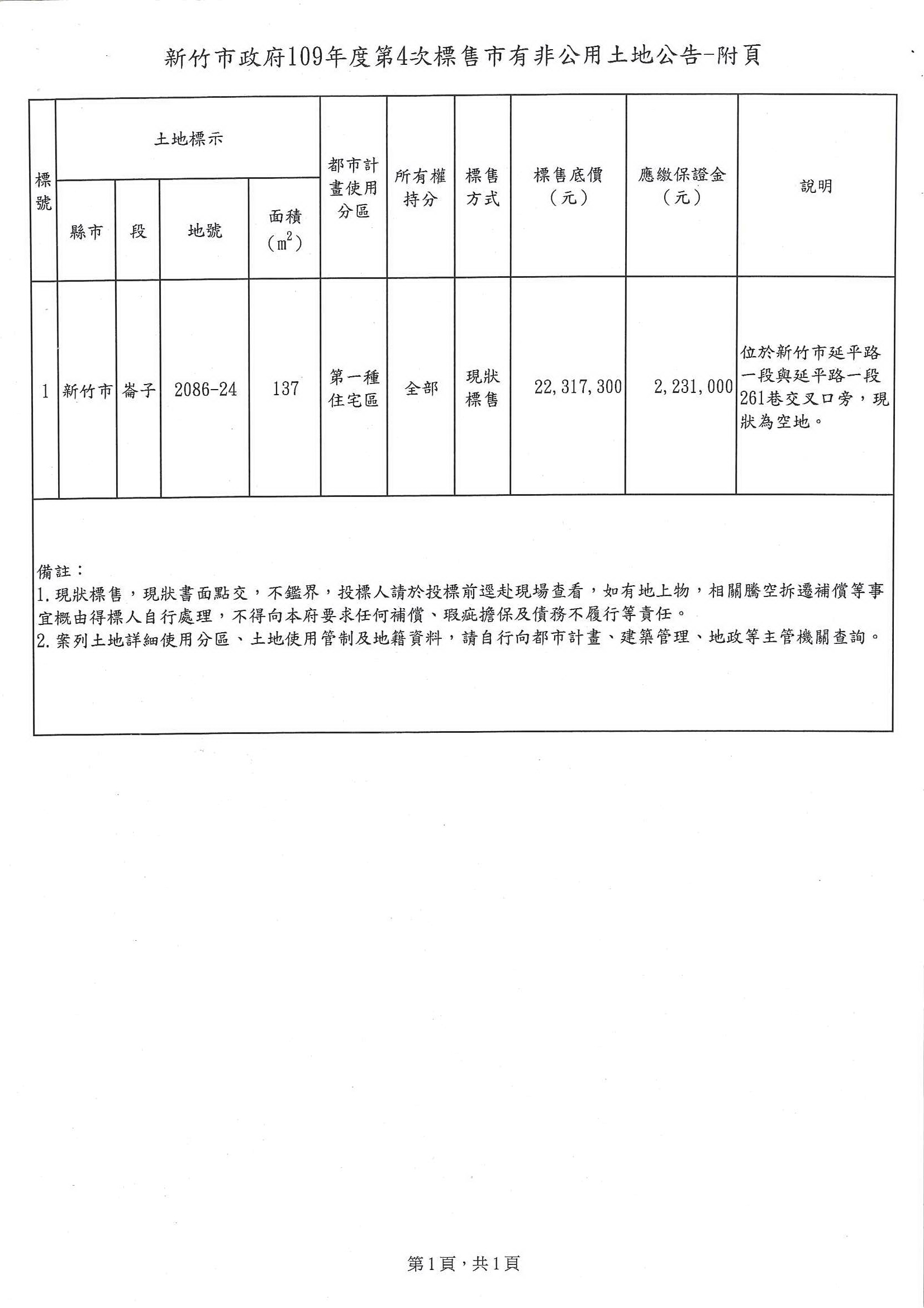 函轉新竹市政府檢送辦理出售坐落新竹市崙子段2086-24地號市有土地標售公告一份,