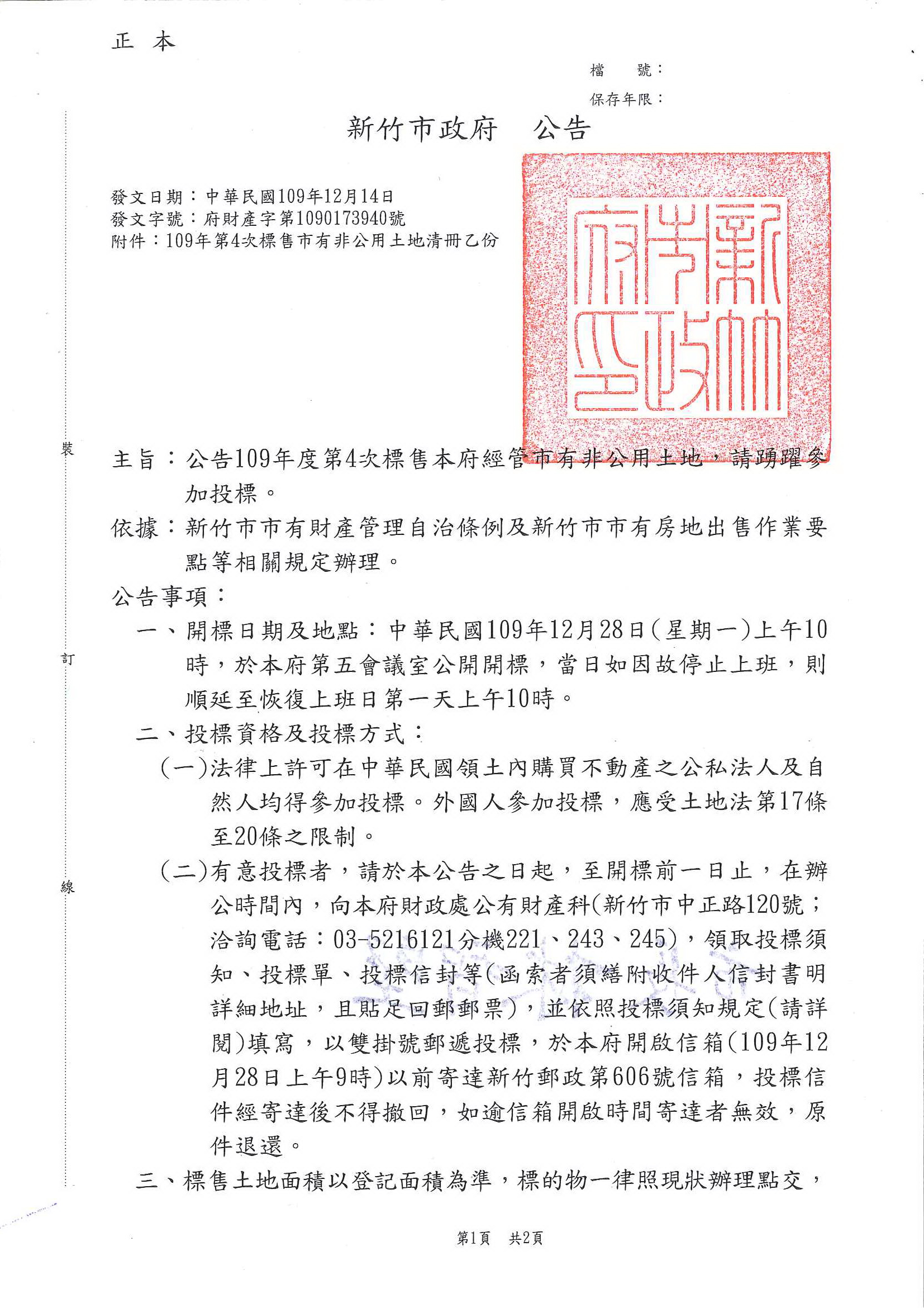 茲訂於109年12月28日上午10時辦理公開標售開標作業,敬請查照!