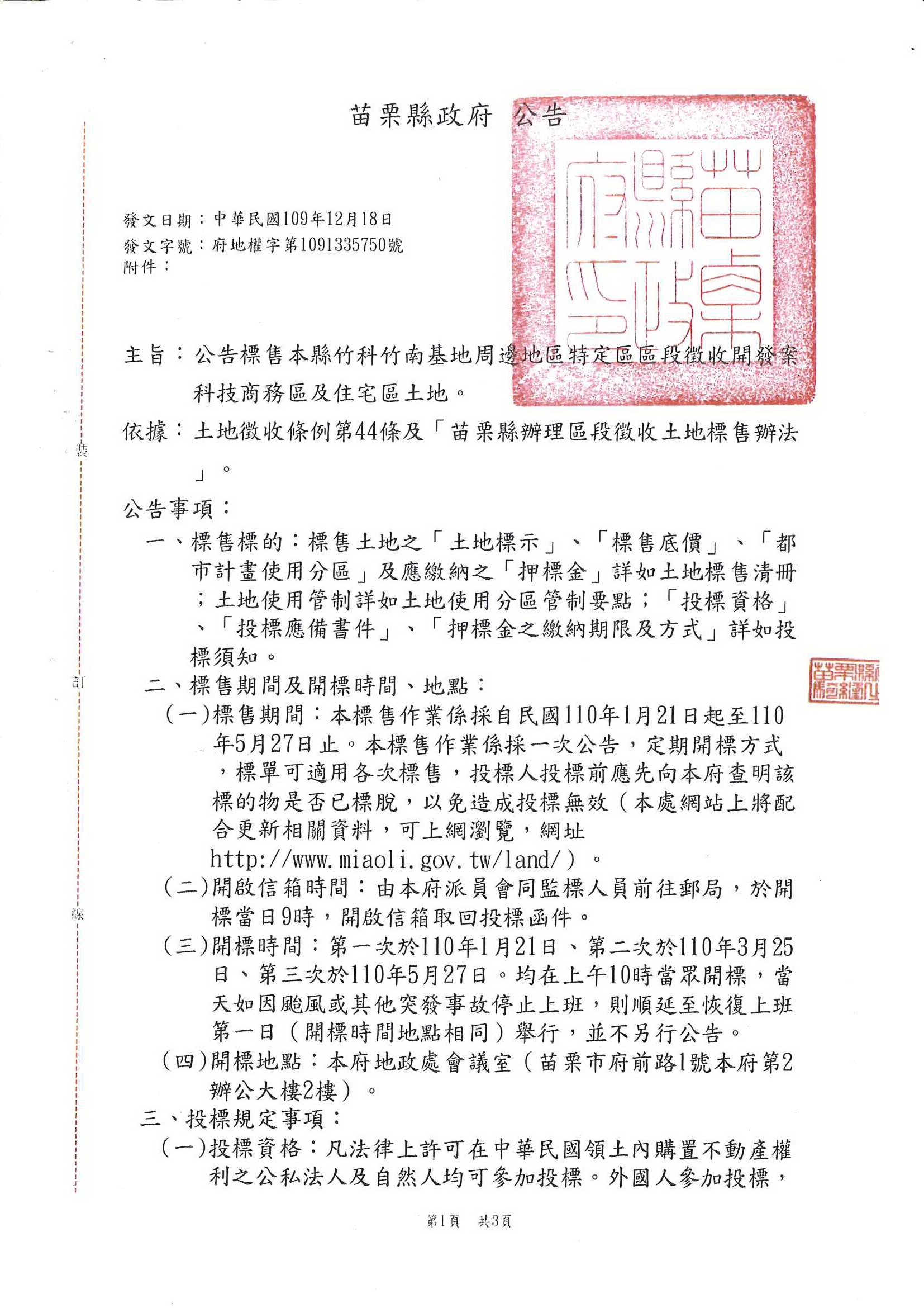 » 函轉苗栗縣政府檢送竹科竹南基地周邊地區特定區區段徵收開發案科技商務區及住宅區土地標售公告,敬請查照!