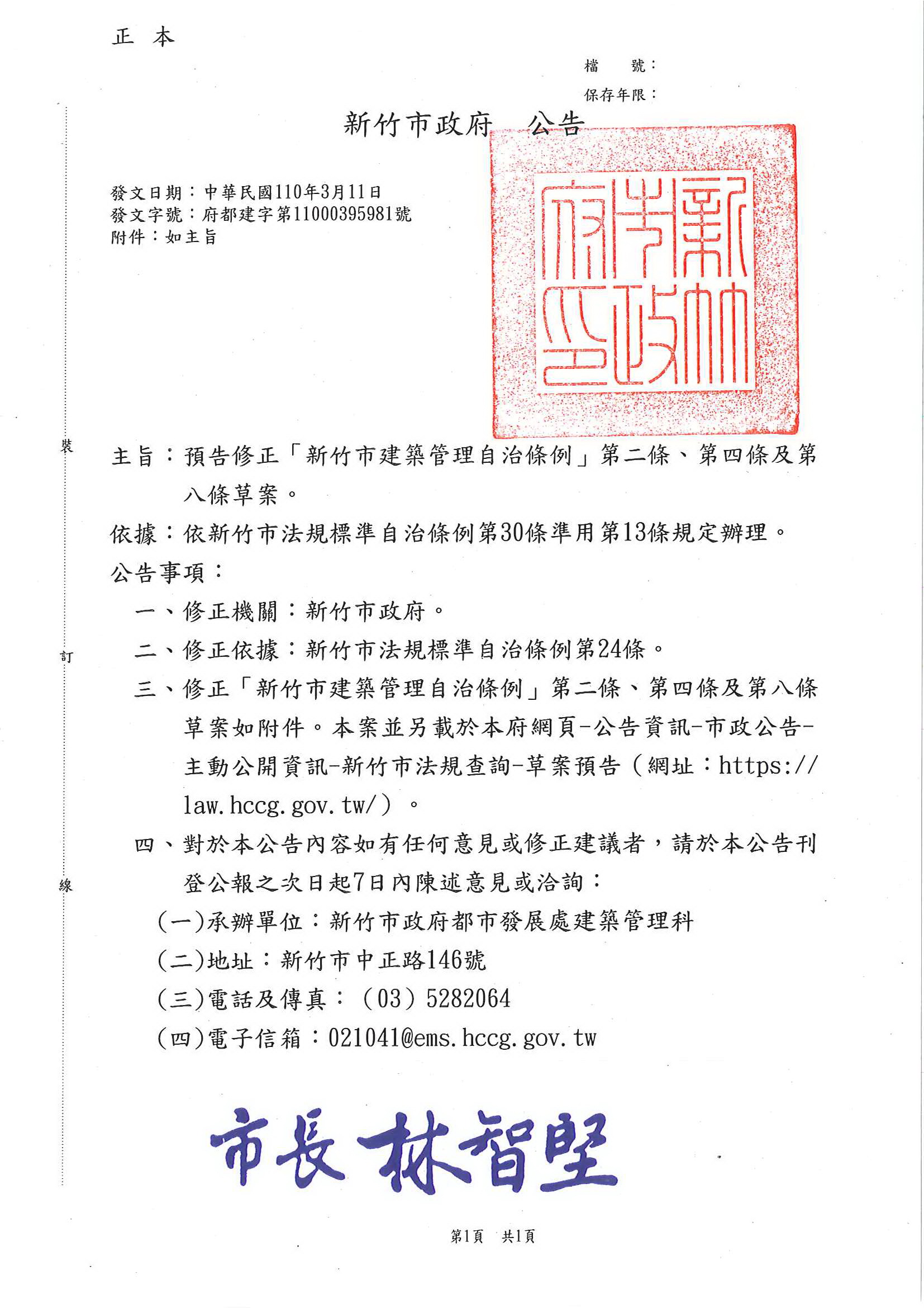 函轉新竹市政府關於預告修正「新竹市建築管理自治條例」第二條,第四條及第八條草案公告,敬請查照!