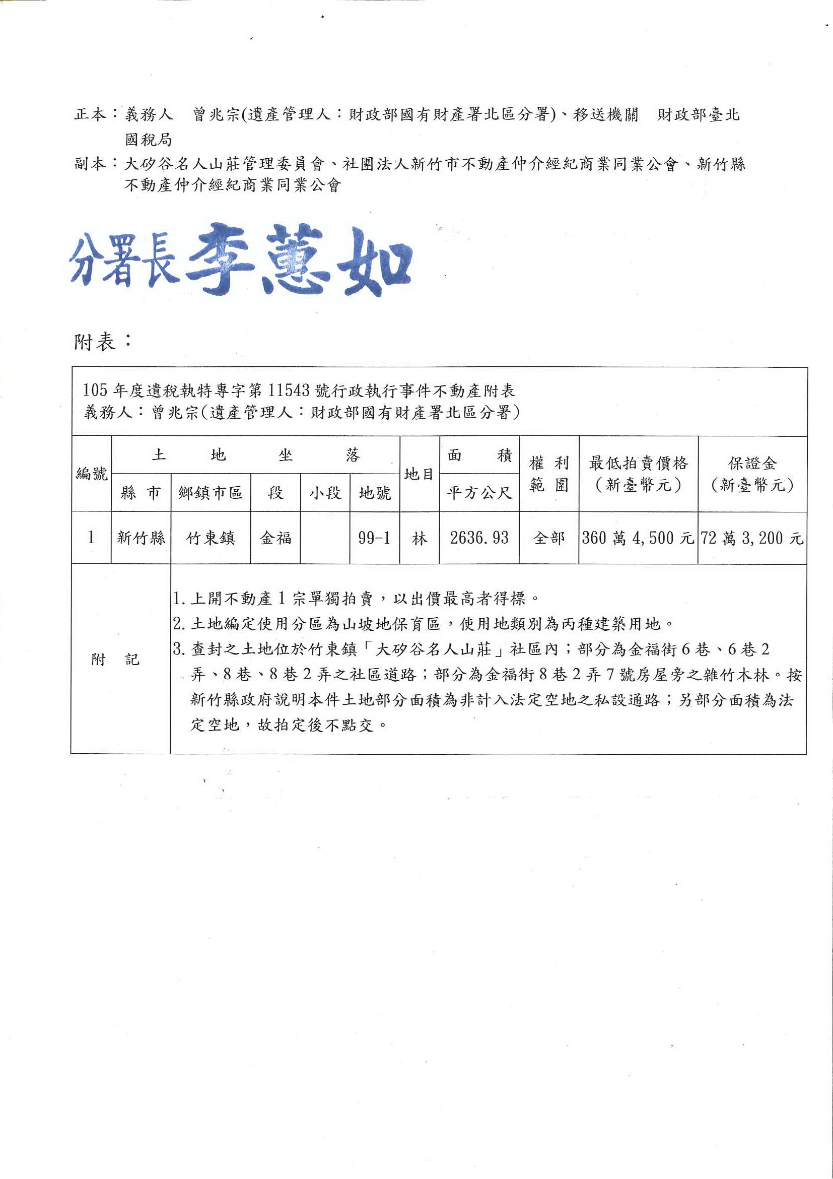 函轉法務部行政執行署新竹分署105年度遺稅執特專字第11543號義務人曾兆宗(遺產管理人:財政部國有財產署北區分署)