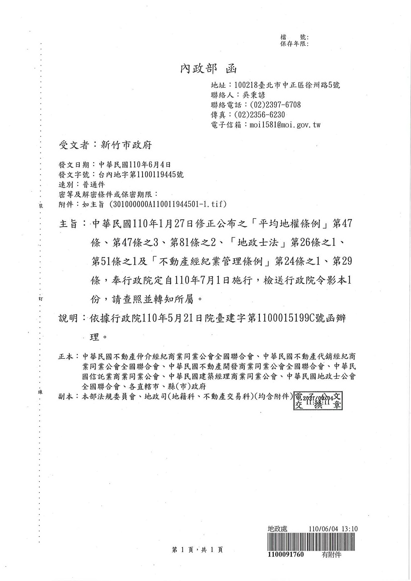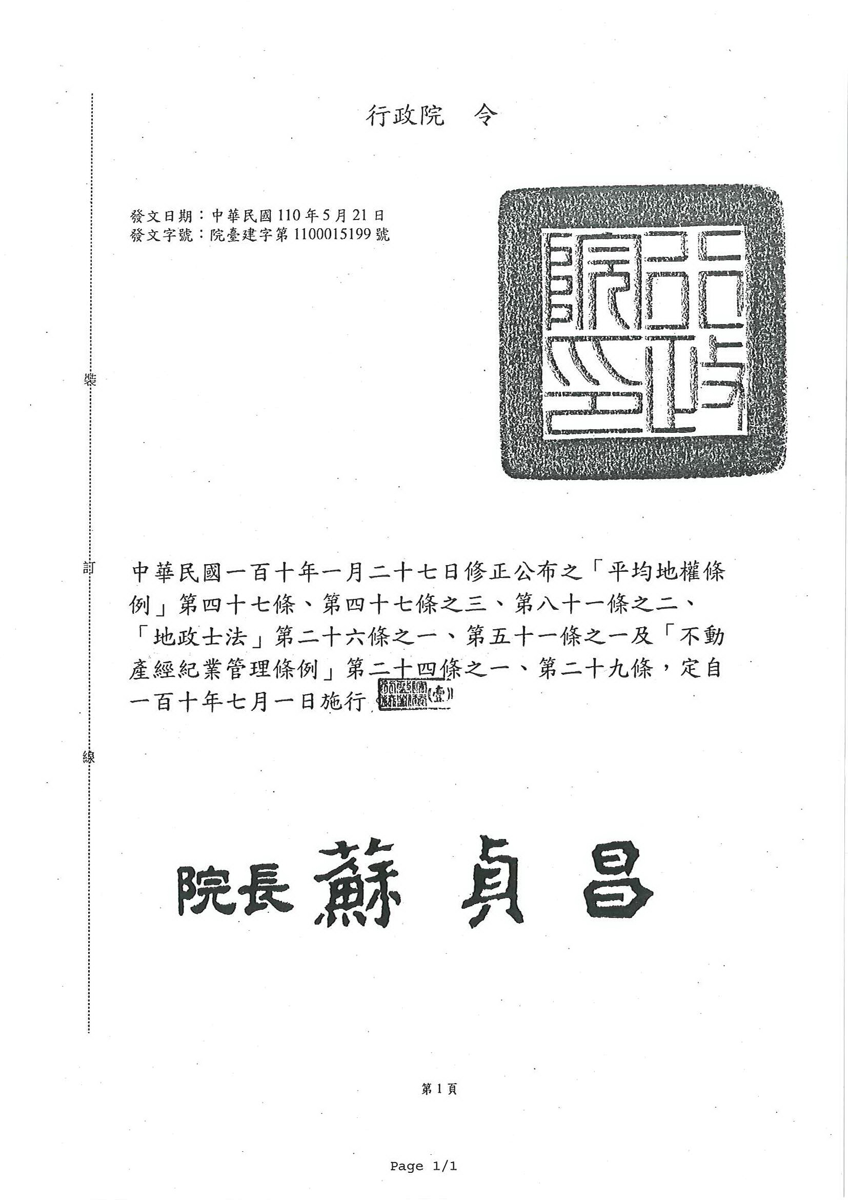 「地政士法」第26條之1.第51條之1及「不動產經紀業管理條例」第24條之1.第29條,定110年7月1日實行令,