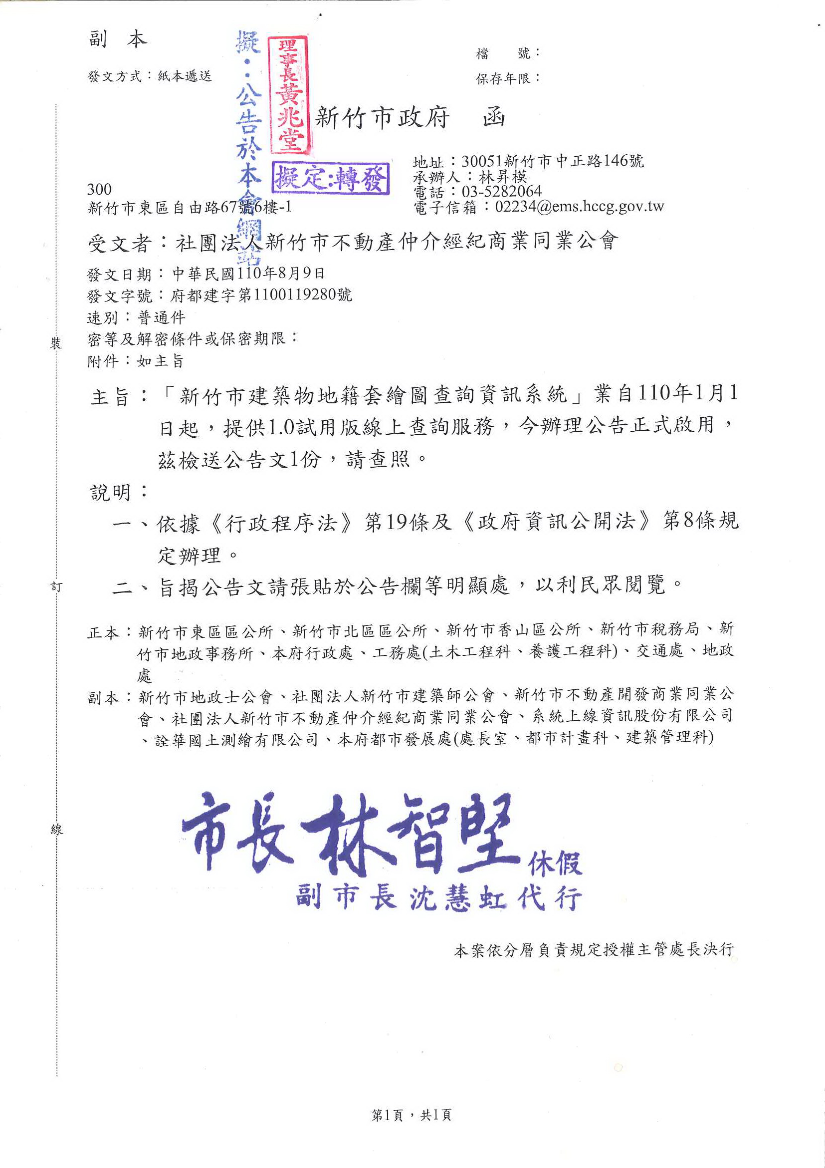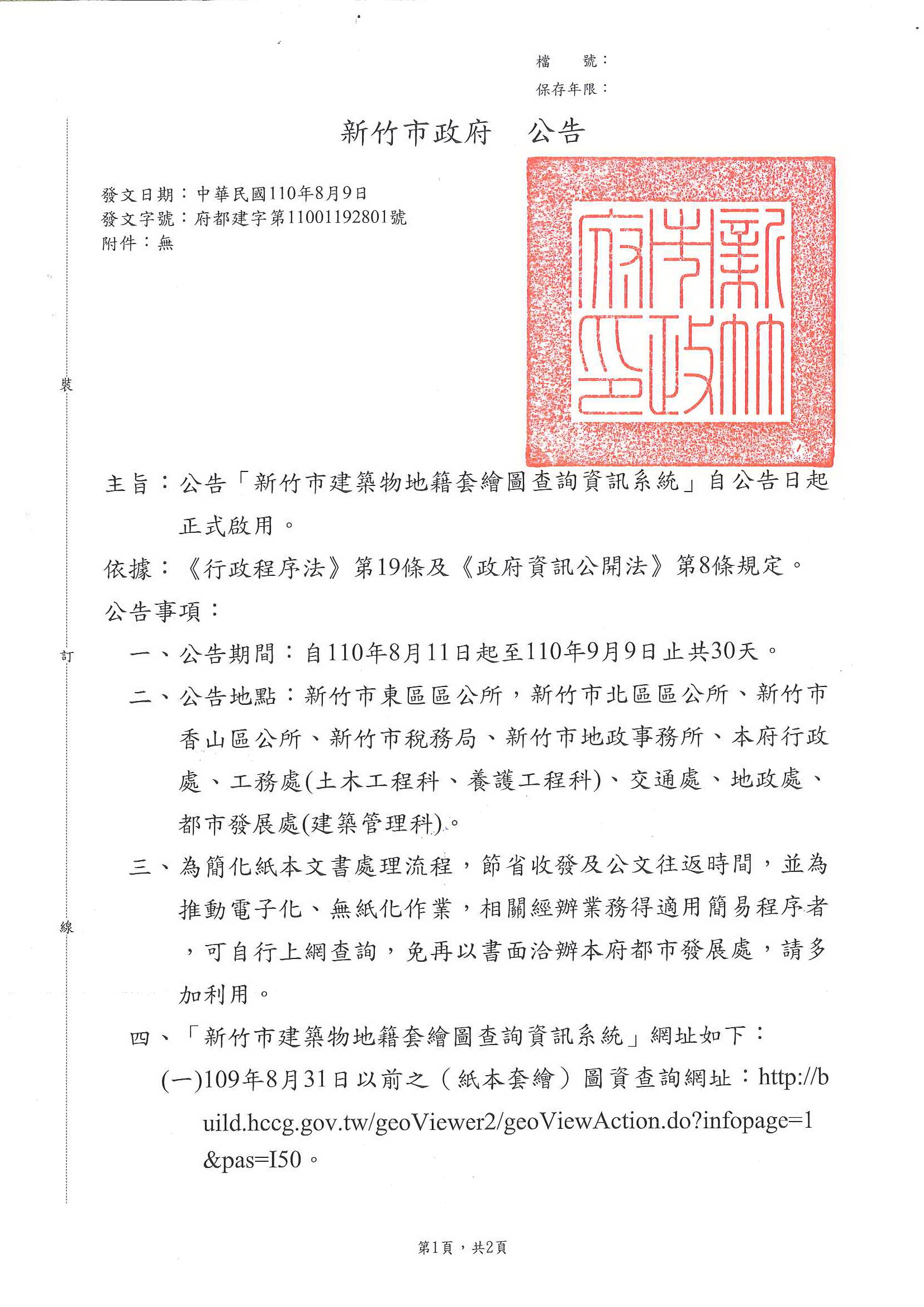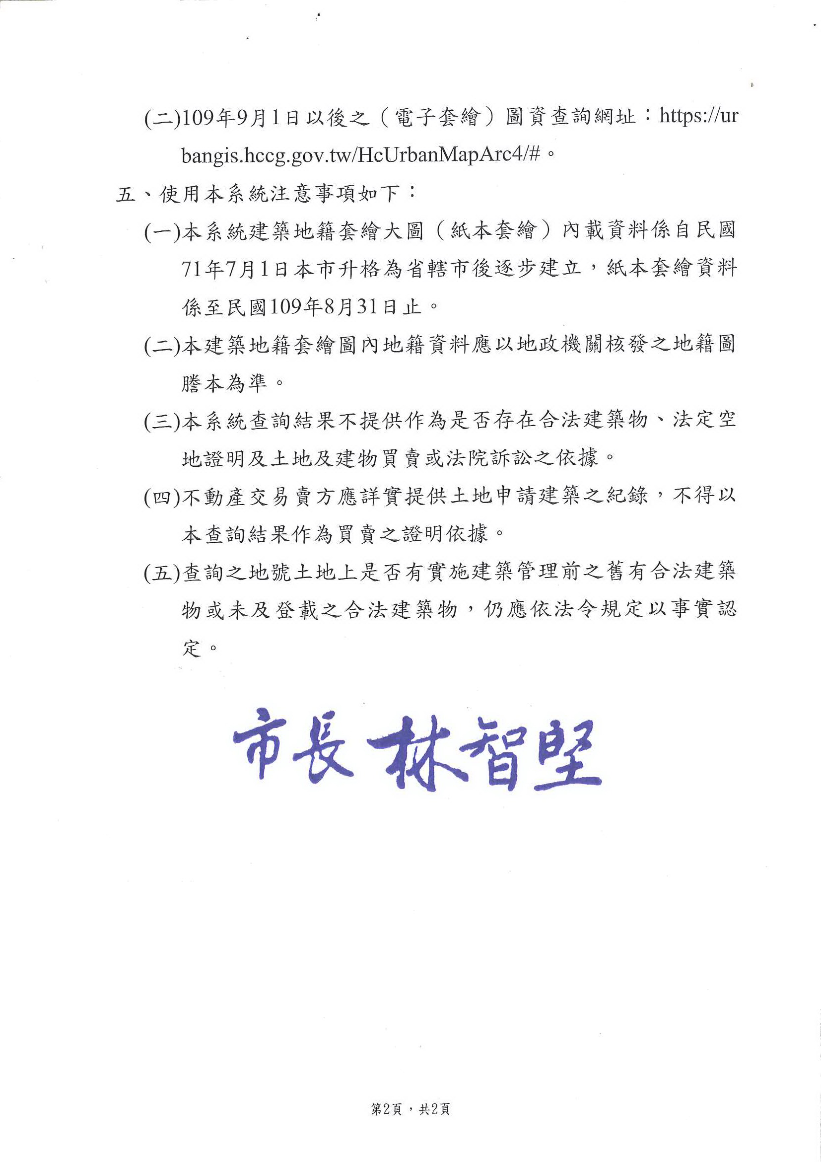 「新竹市建築物地籍套繪圖查詢資訊系統」業自110年1月1日起,提供1.0試用版線上查詢服務,