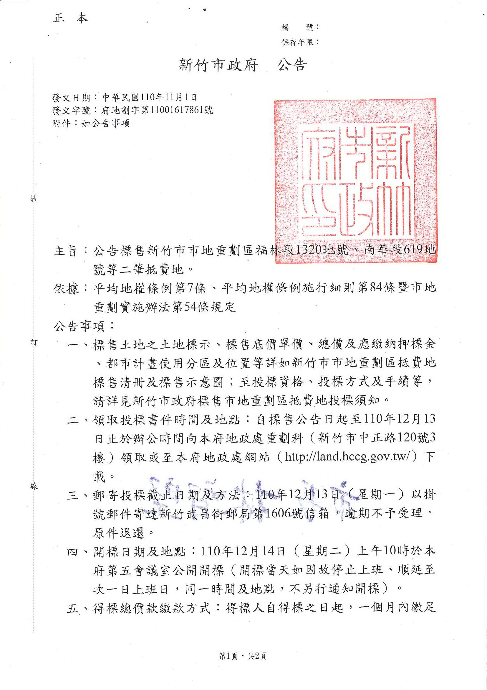 » 函轉新竹市政府檢送本市市地重劃區福林段1320地號.南華段619地號等二筆抵費地標售公告文及其附件1份,敬請查照!