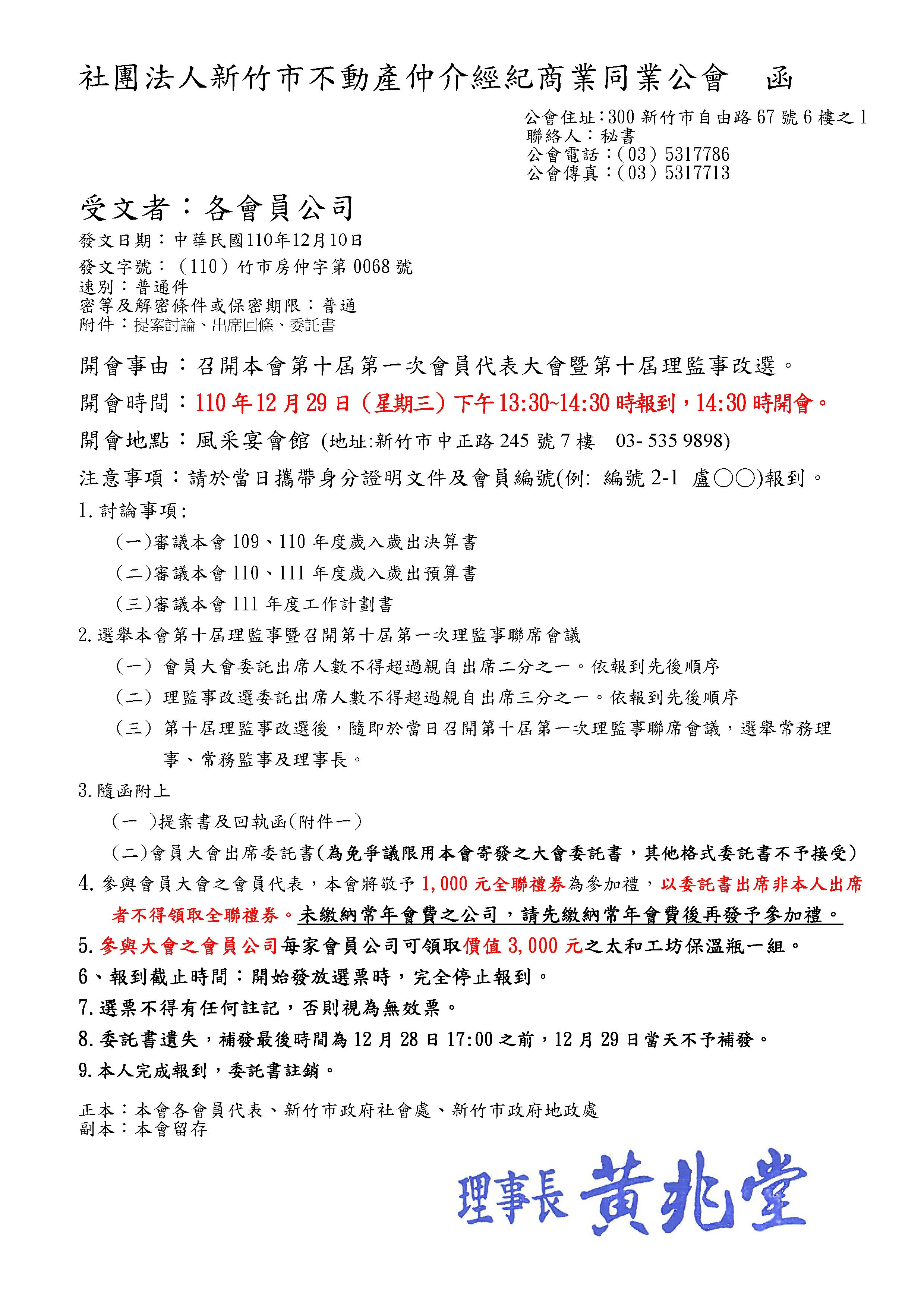 紙本公文已經於12月13日掛號寄出,請各會員代表查收!