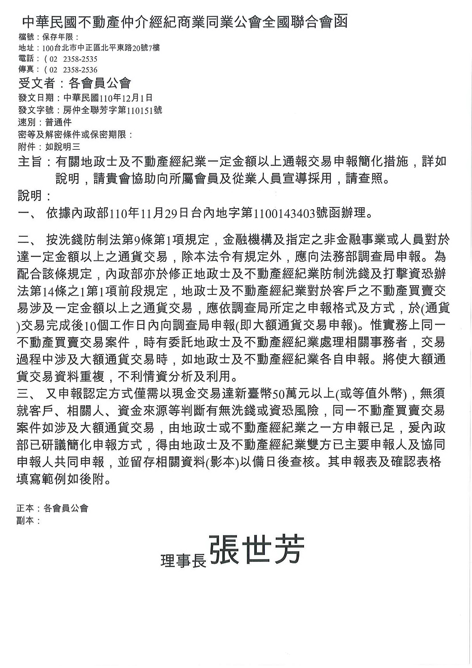 » 函轉省聯會有關地政士及不動產經紀業一定金額以上通報交易申報簡化措施
