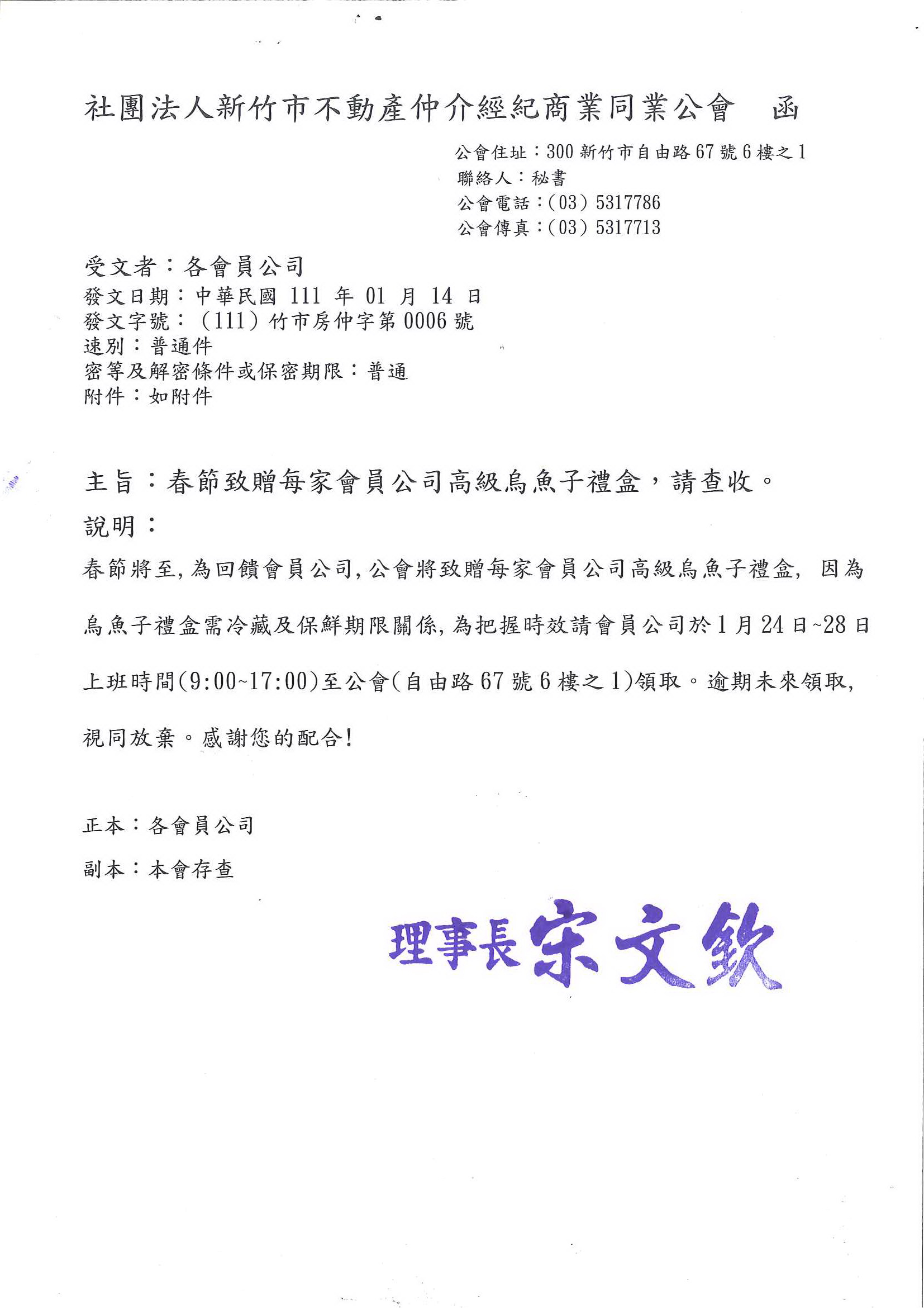 111年春節致贈每家會員公司高級烏魚子禮盒,請查收。