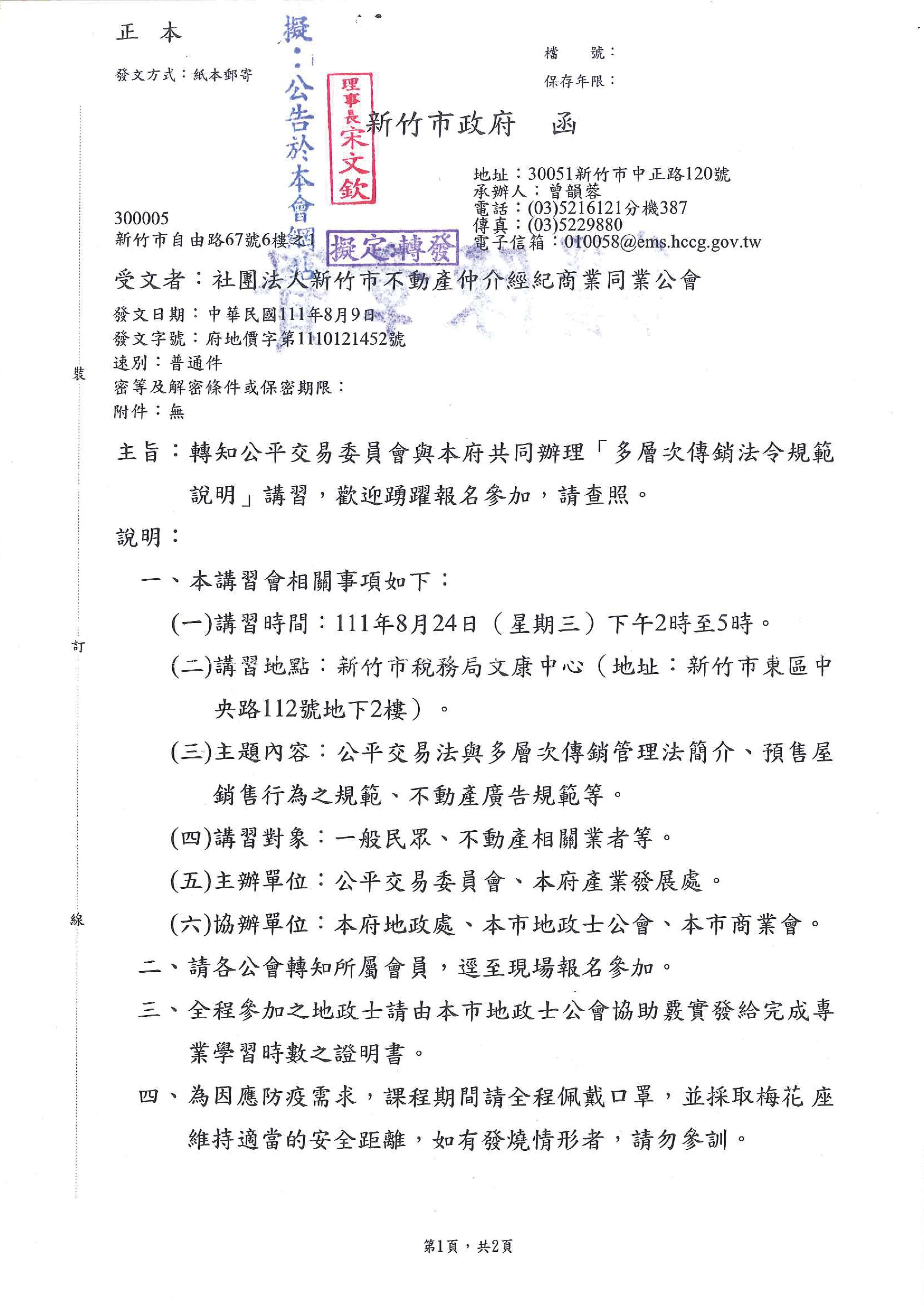 函轉新竹市政府關於公平交易委員會與本府共同辦理「多層次傳銷法令規範說明」講習,