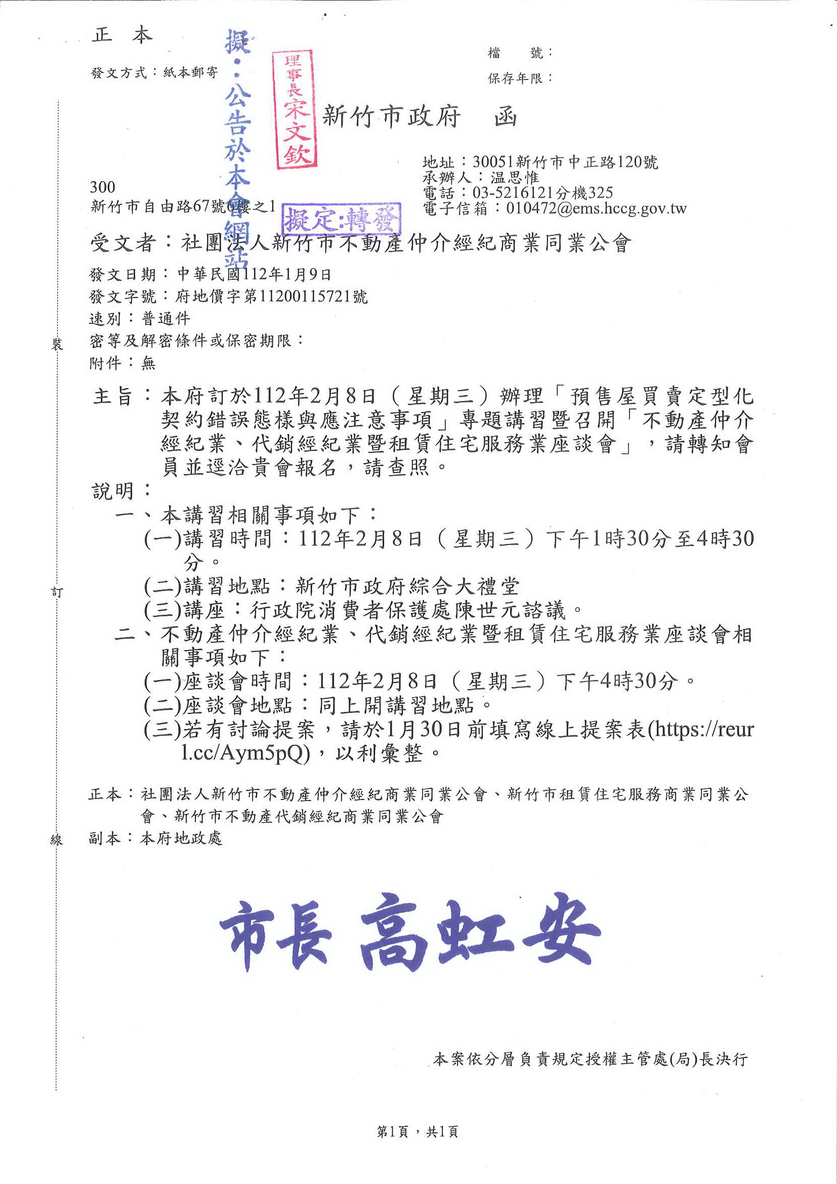 函轉新竹市政府訂於112年2月8日(星期三)辦理「預售屋買賣定型化契約錯誤態樣與注意事項」