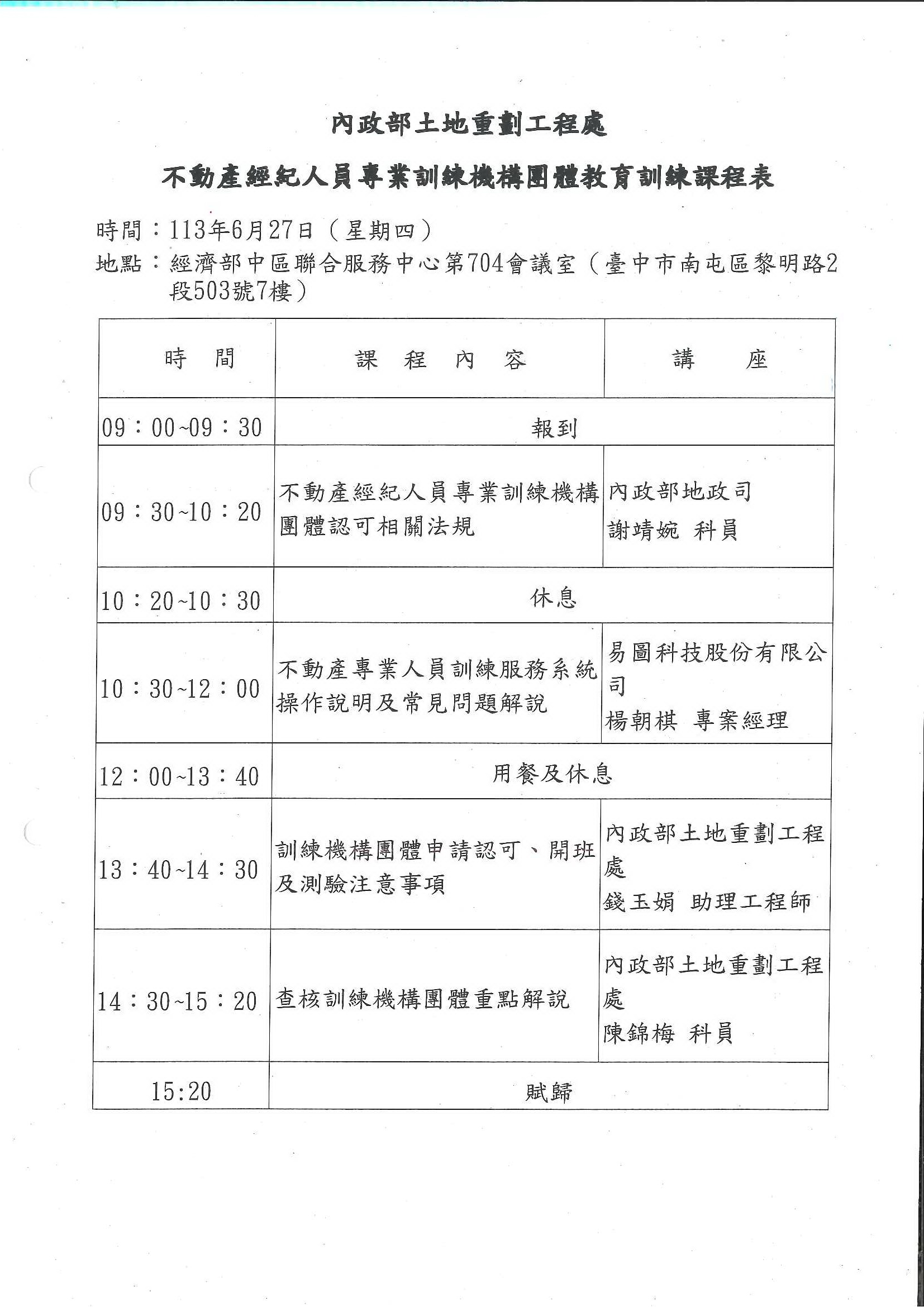 訊息公告 » 本會會務人員將於113年6月27日(星期四)參加內政部舉辦的「不動產經紀人員專業訓練機構團體教育訓練」,如有重要事宜,請次日再進行聯絡,造成不便敬請見諒!