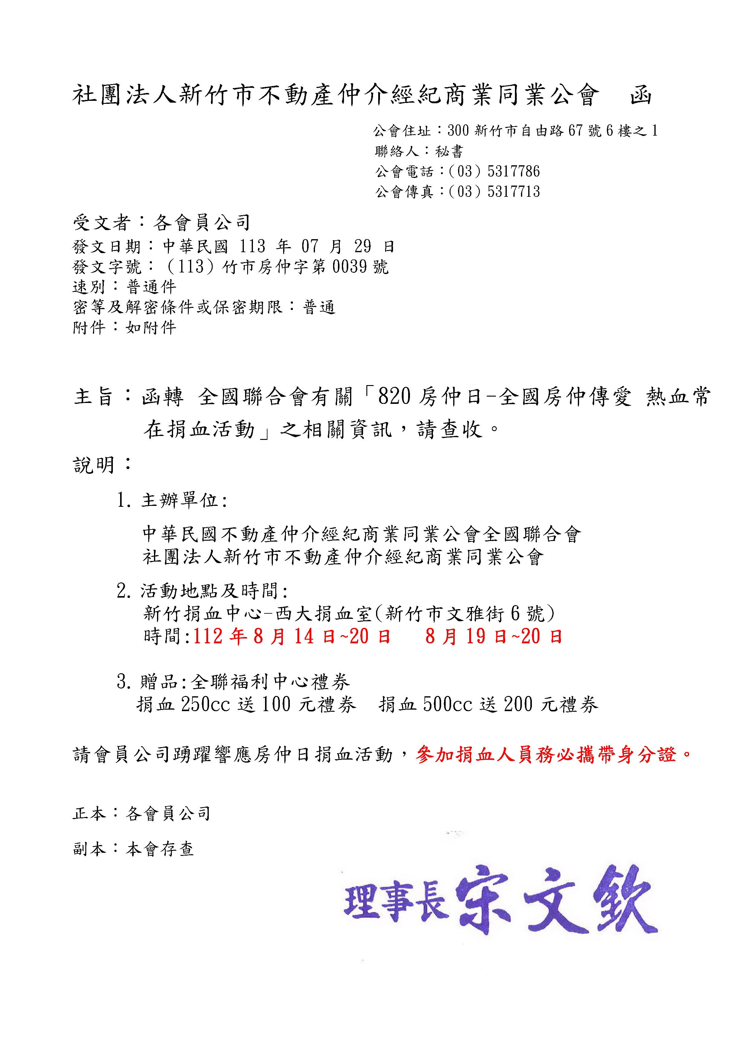 檔案下載(113069函各會員公會暨各縣市公會(820房仲日捐血活動).doc)