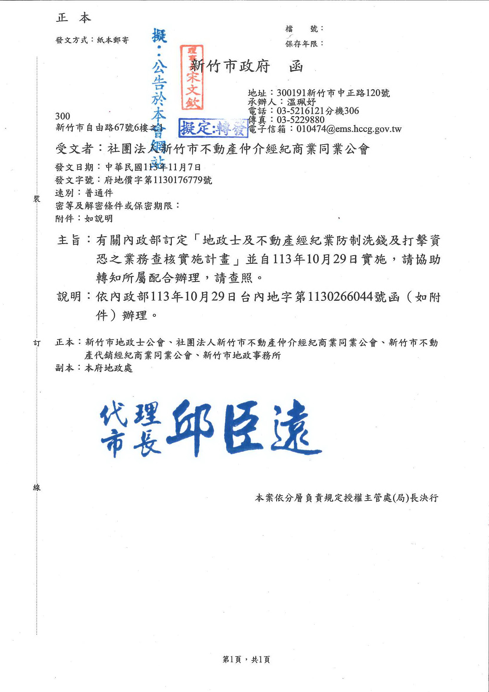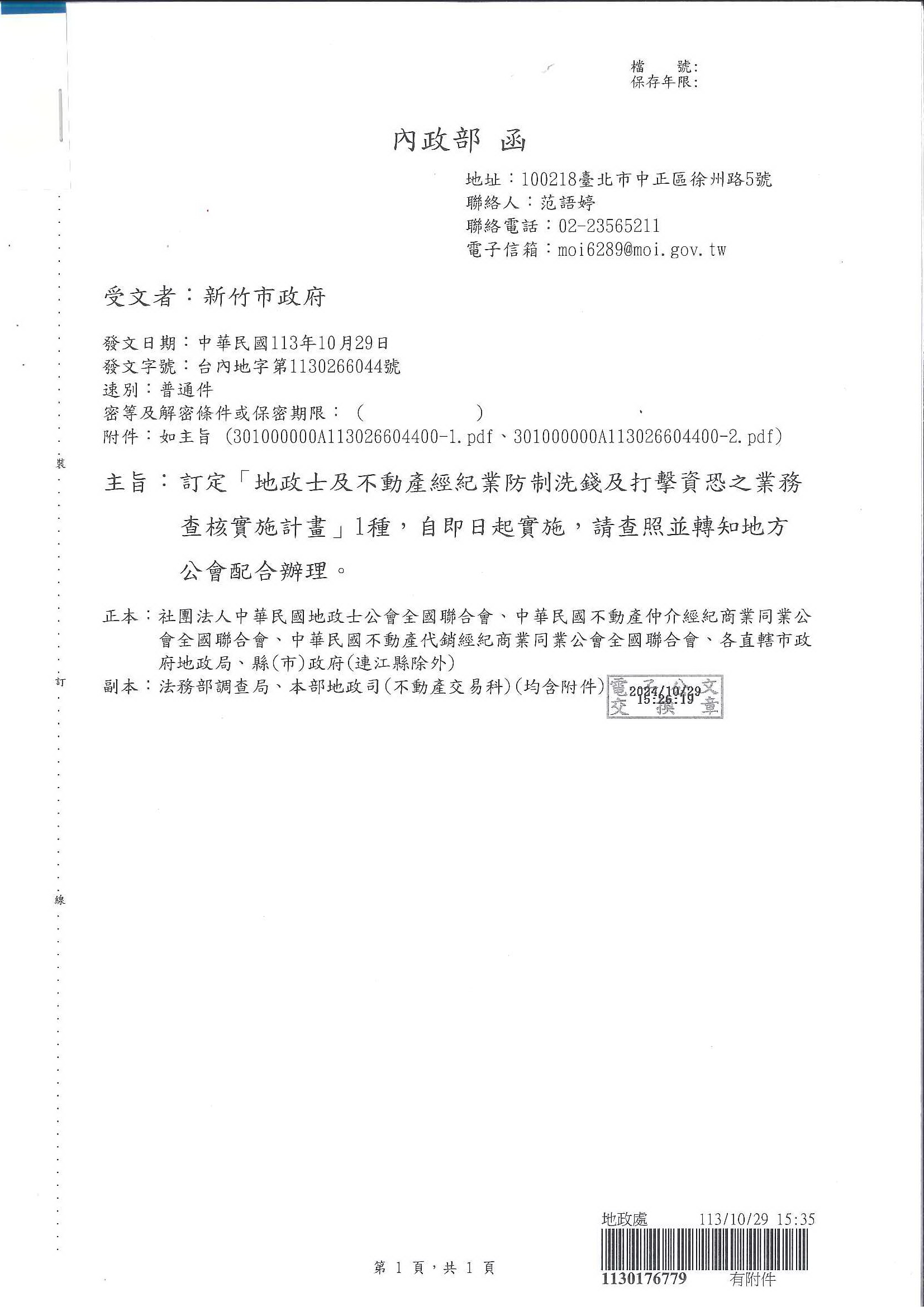函轉新竹市政府有關內政部訂定「地政士及不動產經紀業防制洗錢及打擊資恐之業務查核實施計畫」並自113年10月29日實施,敬請查照!