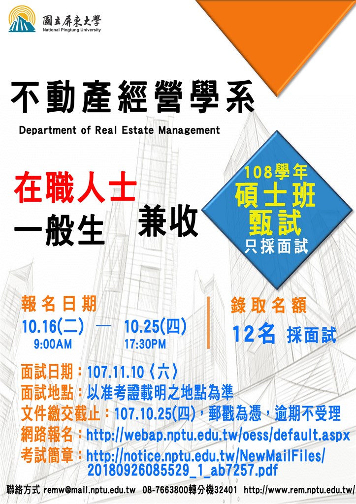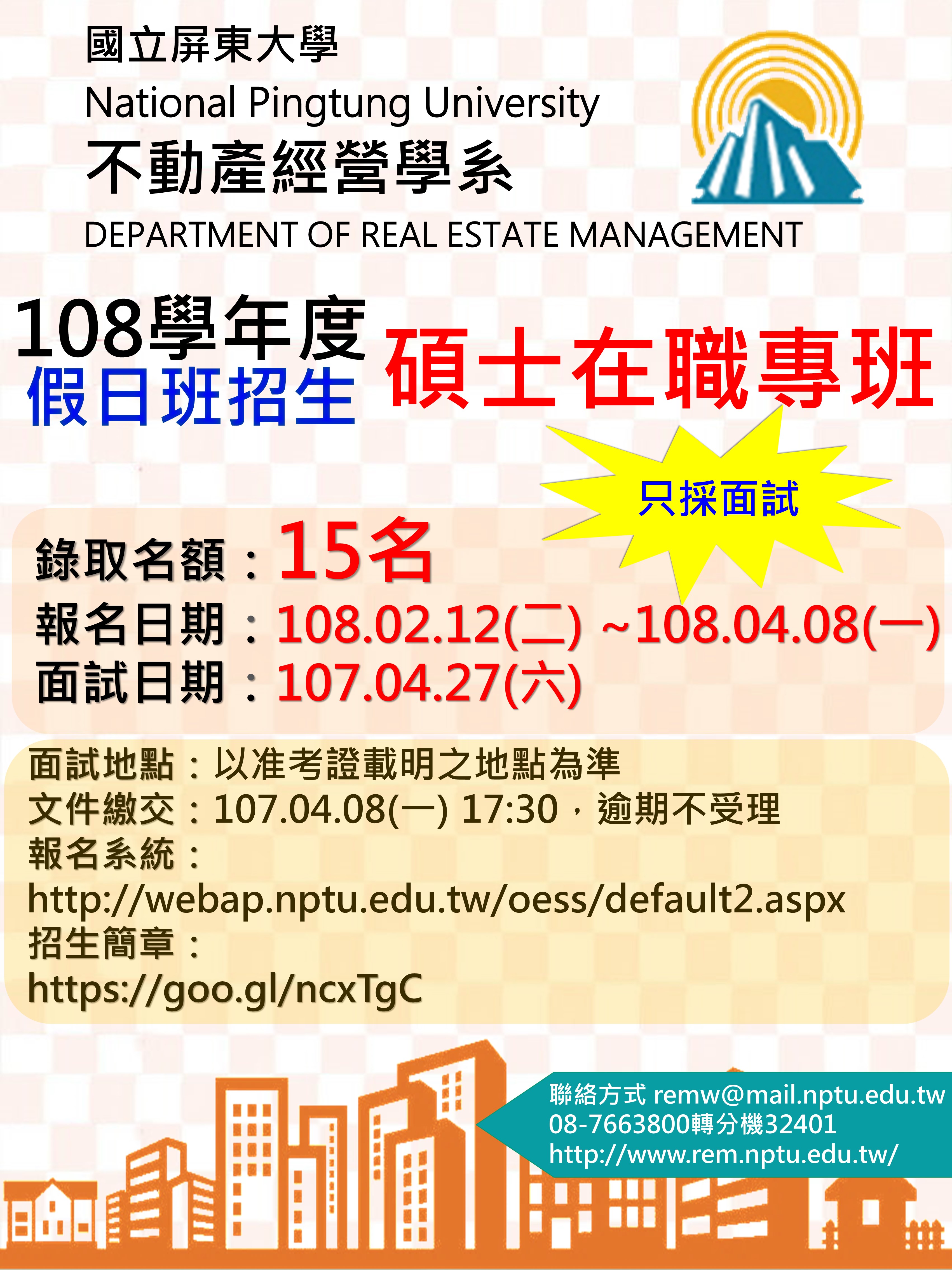 108.02.12~108.04.08 國立屏東大學不動產經營學系假日班招生(碩士在職專班)