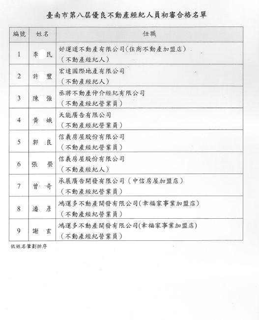 公布臺南市第8屆優良不動產經紀人員選拔初審合格名單如下: �...
