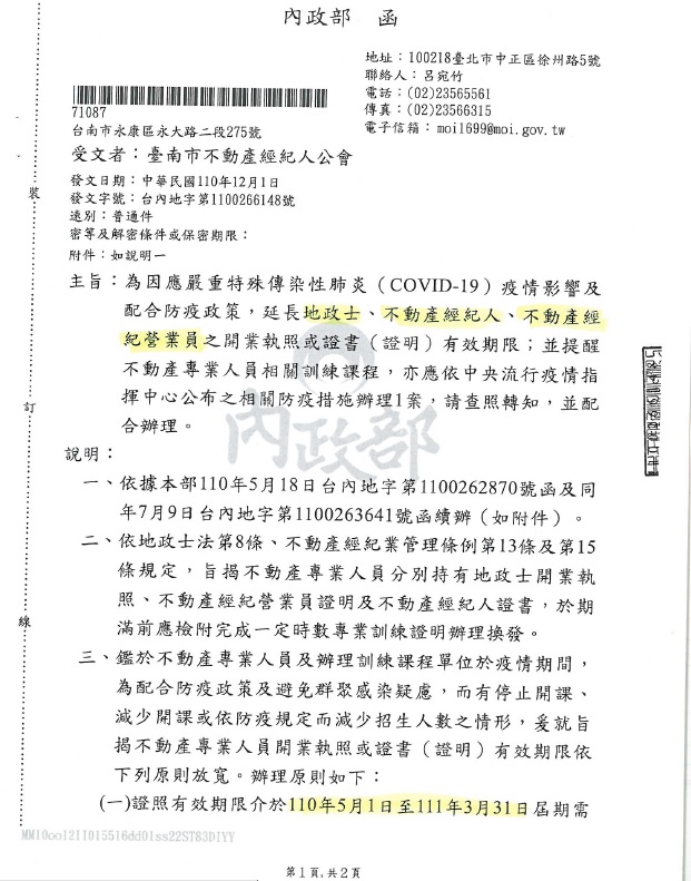 110.12.03 地政士、不動產經紀人、不動產經紀營業員執照或證書(證明)效期再展延至111年4月1日
