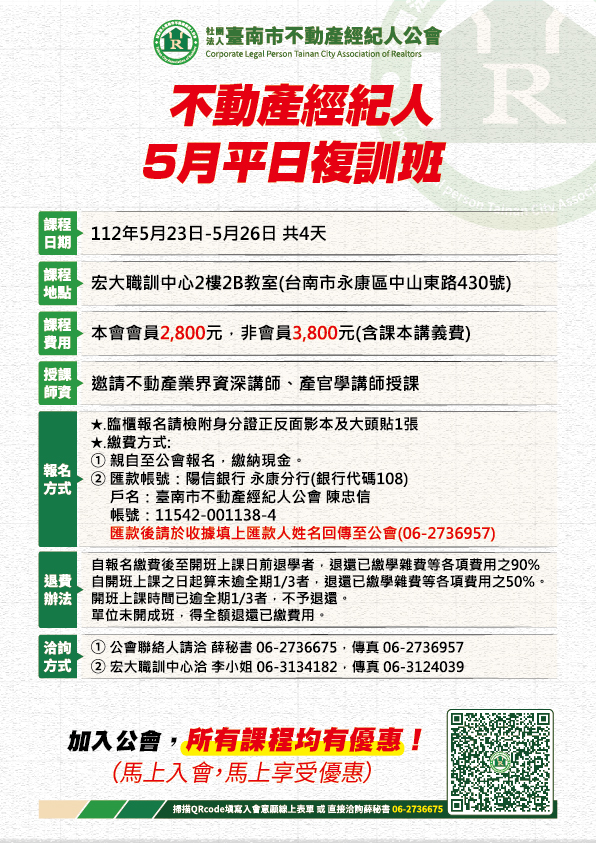 5月份經紀人平日複訓班開跑囉~ 詳細課程及報名資訊如下, 現主�...