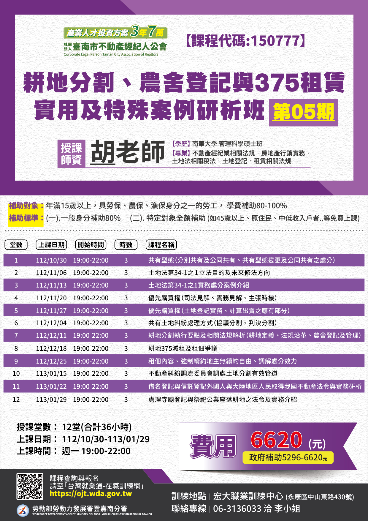 【社團法人臺南市不動產經紀人公會 開課資訊】 此班為本公會開課