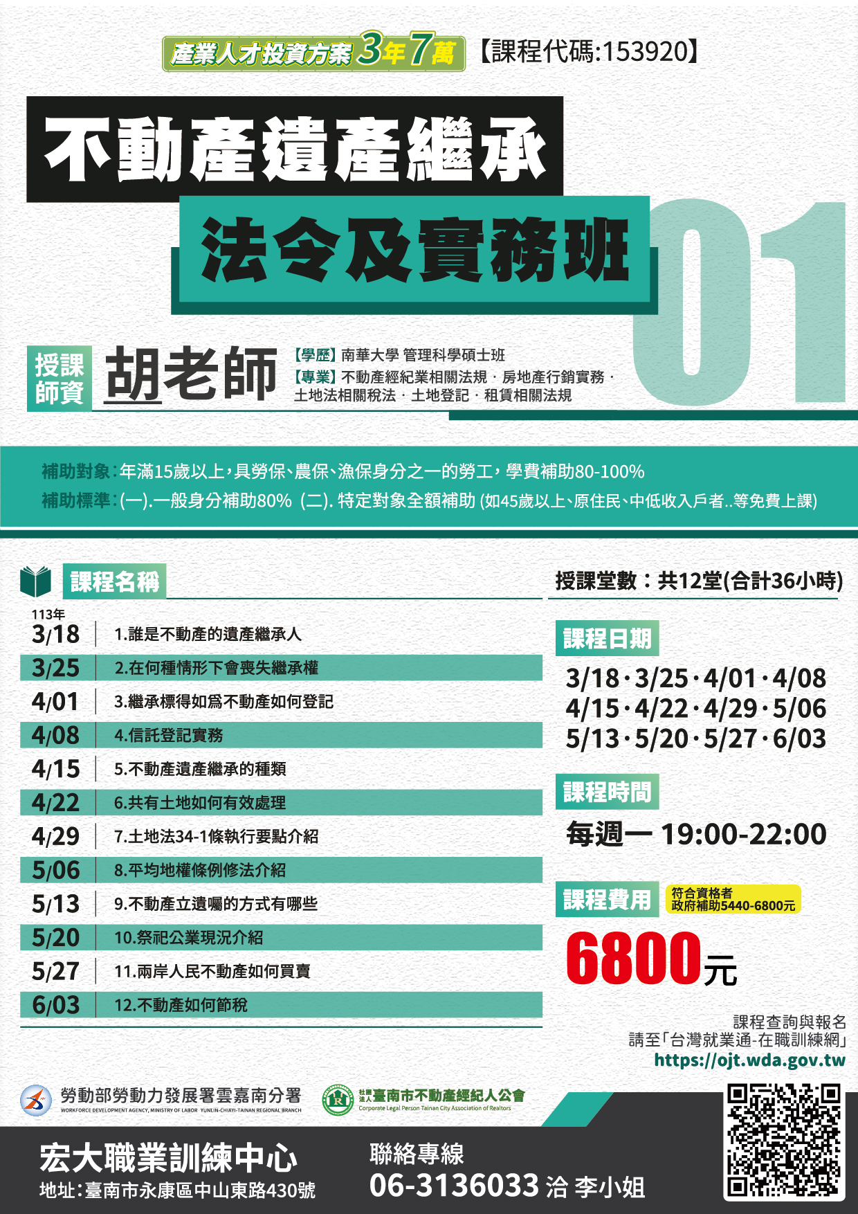 【社團法人臺南市不動產經紀人公會 開課資訊】 此班為本公會開課的~...