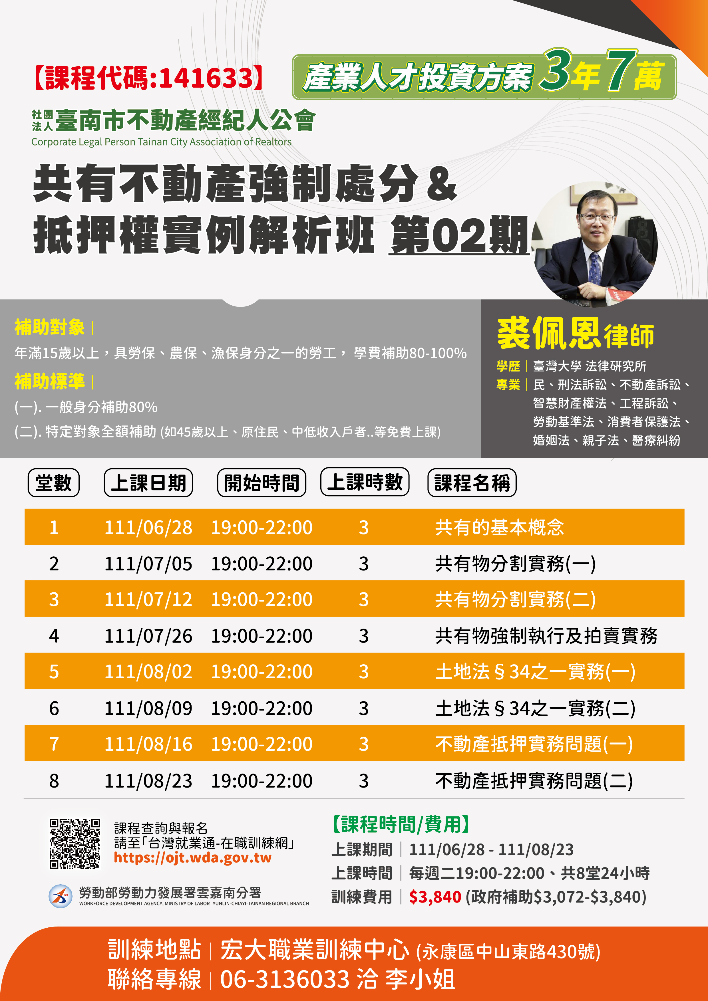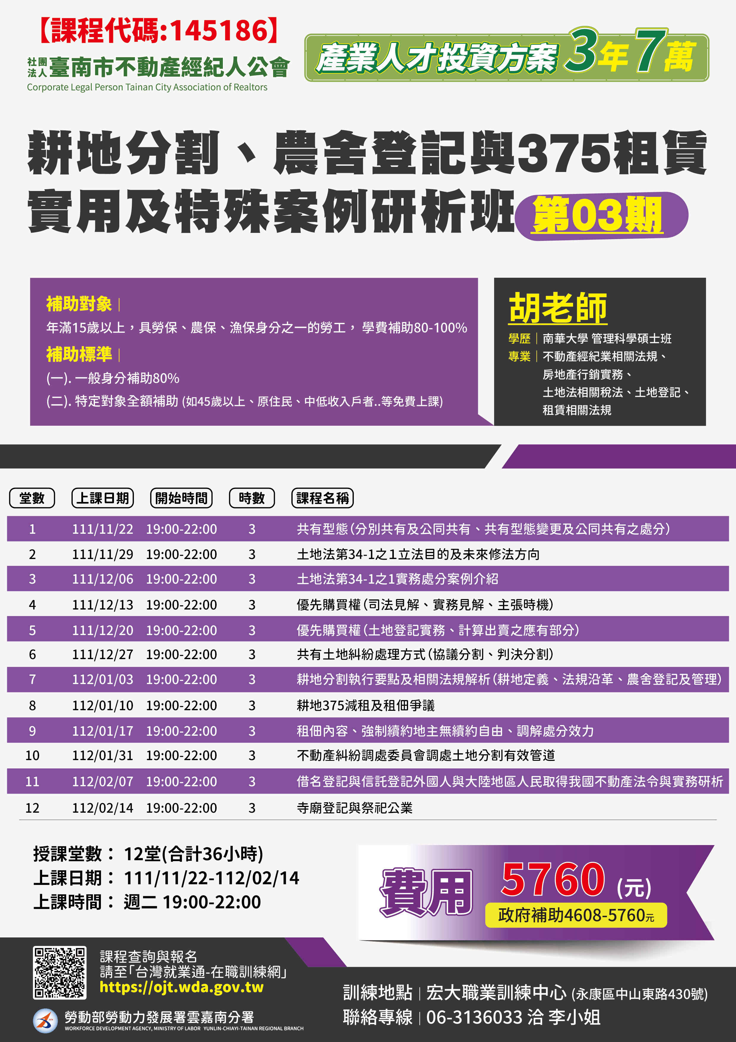 【社團法人臺南市不動產經紀人公會 開課資訊】 此班為本...