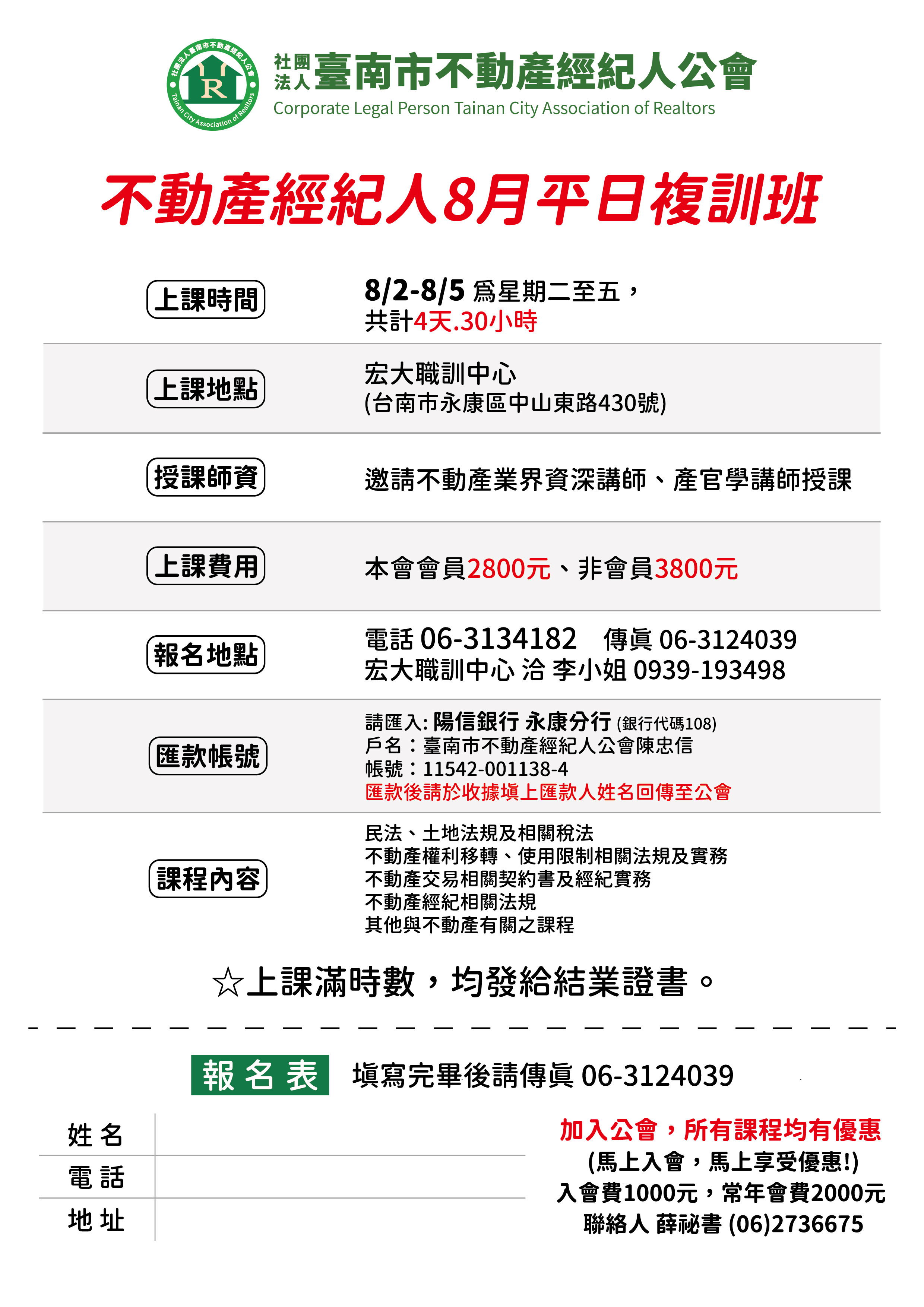 【社團法人臺南市不動產經紀人公會 開課資訊】 此班為本公會開課�...
