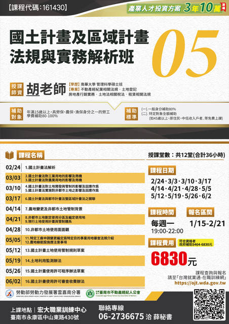 【課程代碼】161430【報名日期】114/01/15~114/02/21止【上課日期】114/02/24~114/06/02 每週一19-22時【招生人數】18人 【訓練時數】36小時,共12堂【報名網站】https://ojt.wda.gov.tw/ClassSearch/Detail?OCID=161430&plantype=1