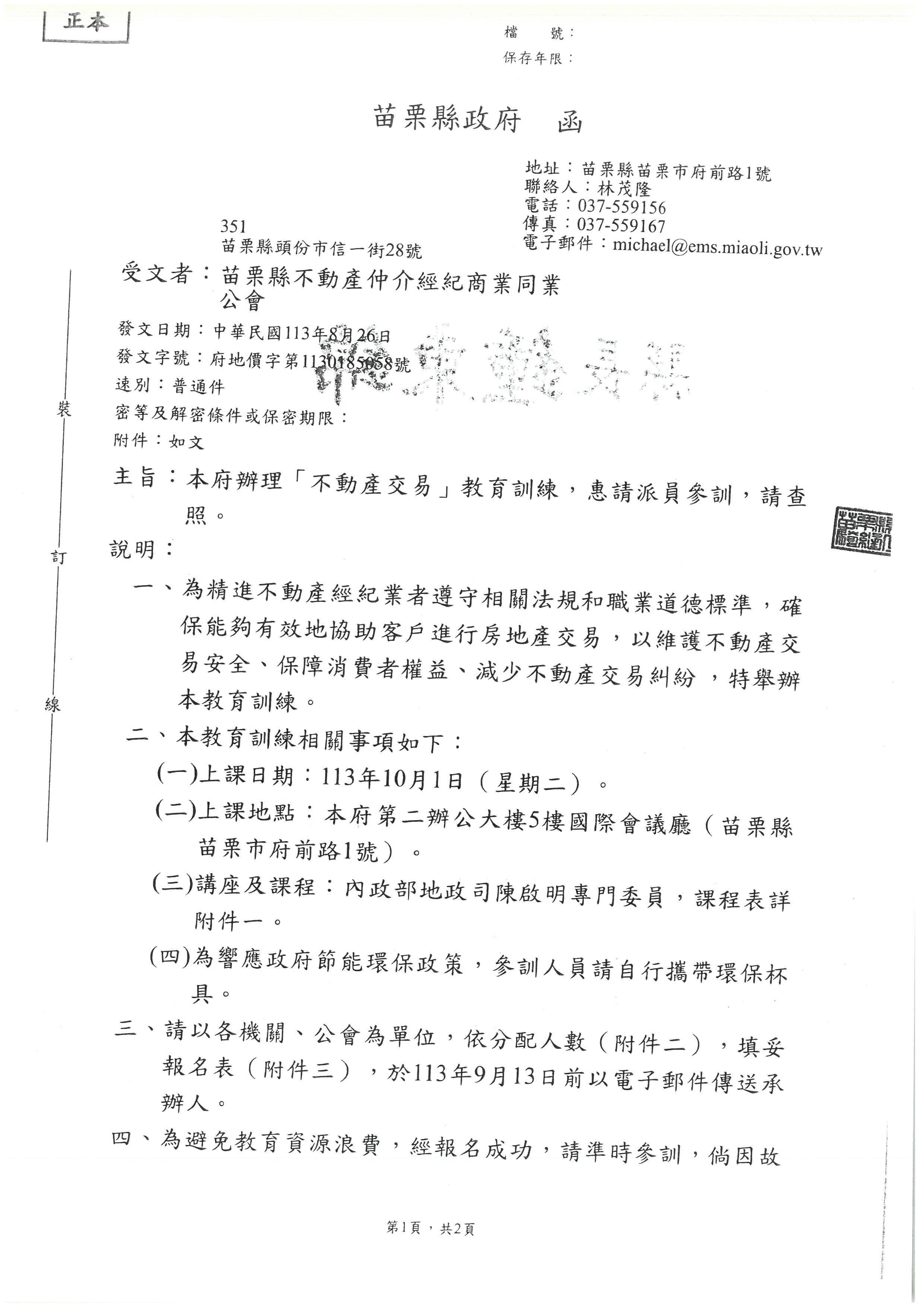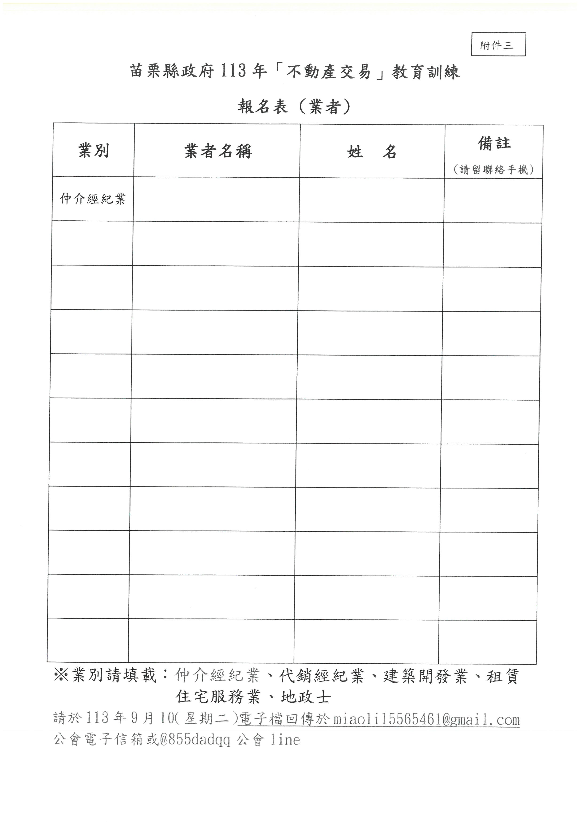 檔案下載(公會發文113苗縣房仲圖字第076號苗栗縣政府不動產交易6-1.jpg)檔案下載(公會發文113苗縣房仲圖字第076號苗栗縣政府不動產交易6-2.jpg)檔案下載(公會發文113苗縣房仲圖字第076號苗栗縣政府不動產交易6-3.jpg)檔案下載(公會發文113苗縣房仲圖字第076號苗栗縣政府不動產交易6-4.jpg)檔案下載(公會發文113苗縣房仲圖字第076號苗栗縣政府不動產交易6-5.jpg)檔案下載(公會發文113苗縣房仲圖字第076號苗栗縣政府不動產交易6-6.jpg)檔案下載(附件三(參訓人員報名表)-業者.doc)